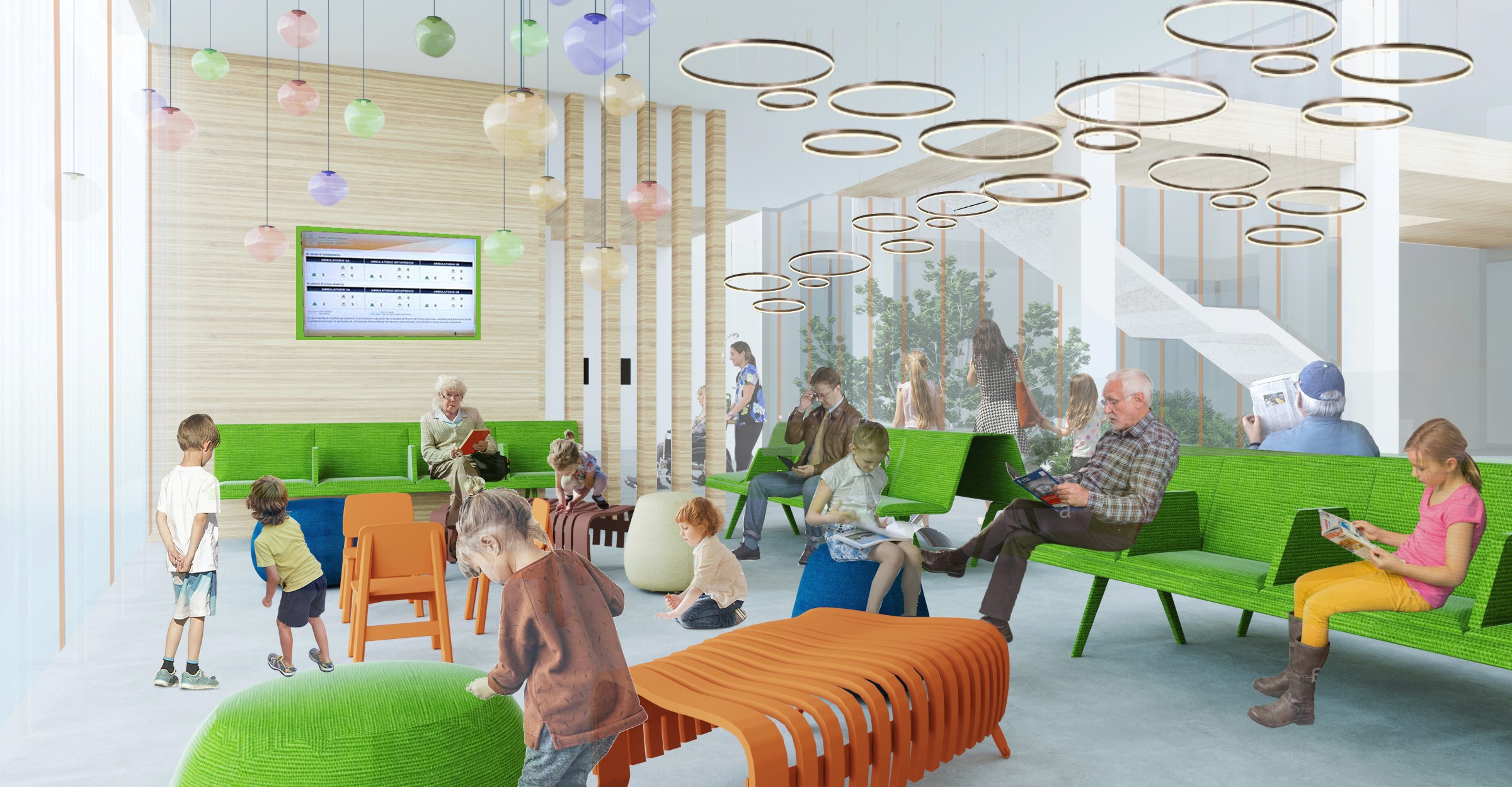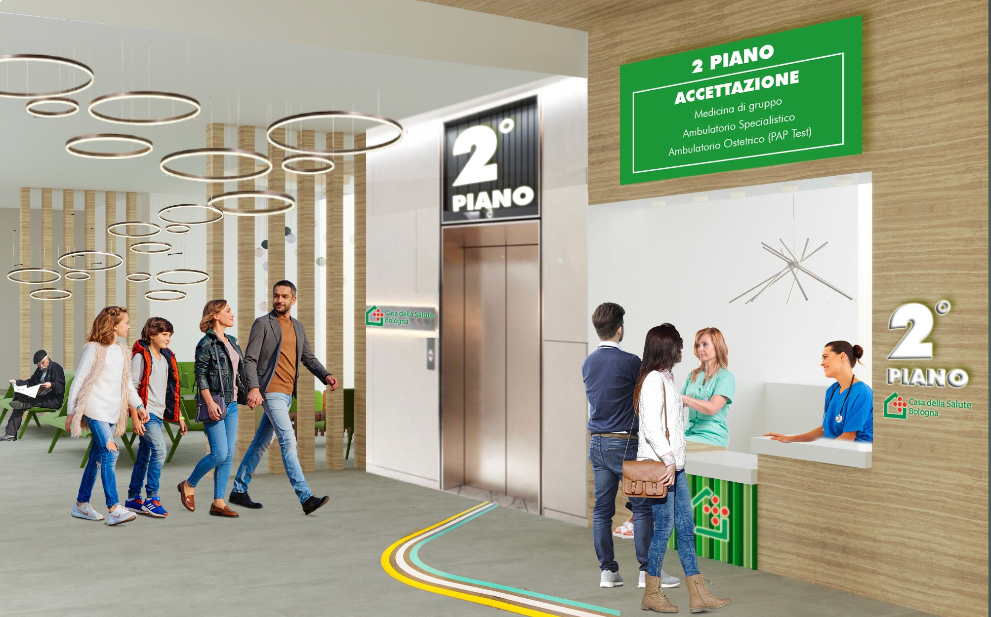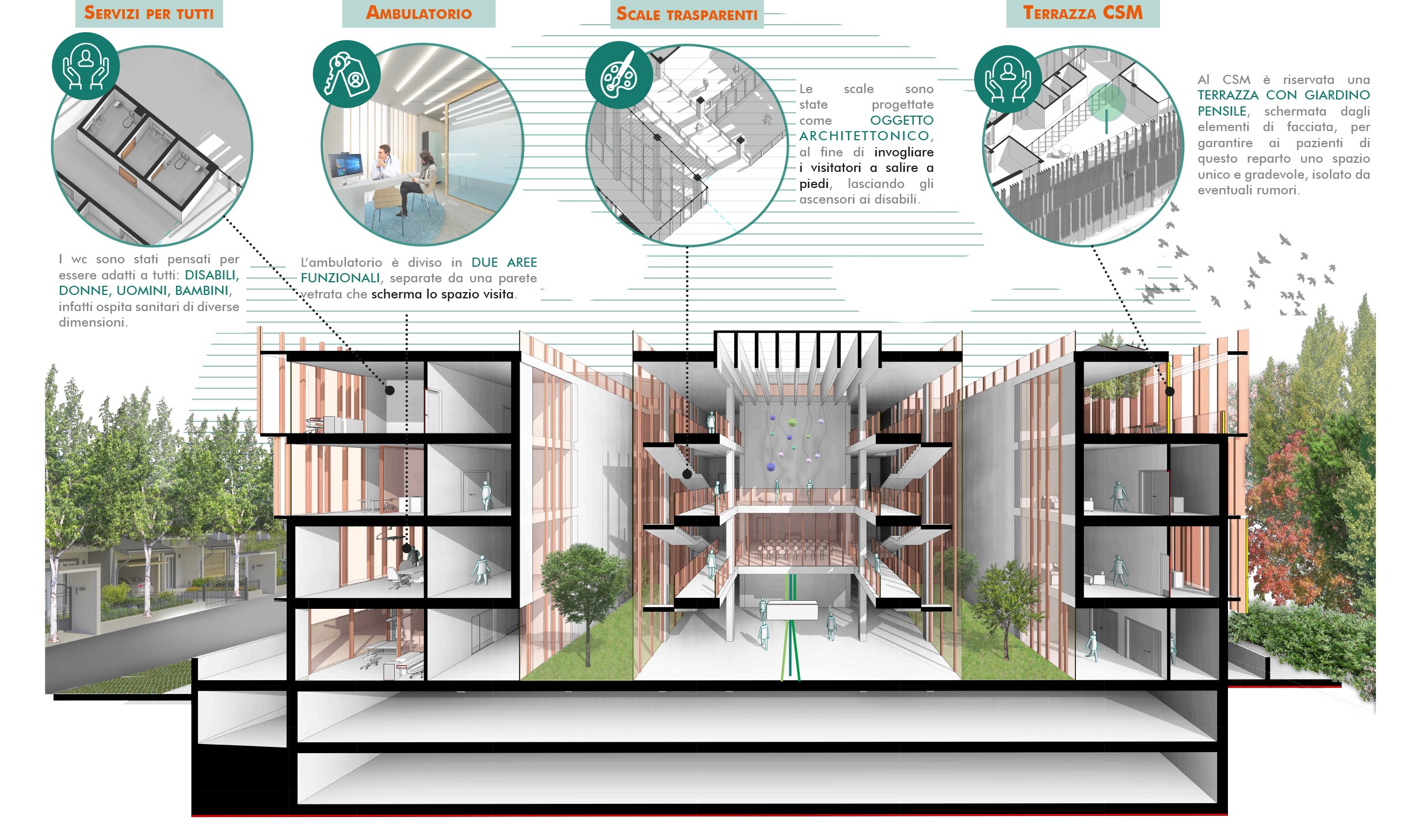 Al piano terra sono presenti le funzioni più pubbliche e amministrative, mentre salendo troviamo ambulatori sempre più specializzati. Ogni piano è dotato di uno spazio di accoglienza e di servizi igienici, gender free e posizionati in egual misura e posizione su tutti i livelli.