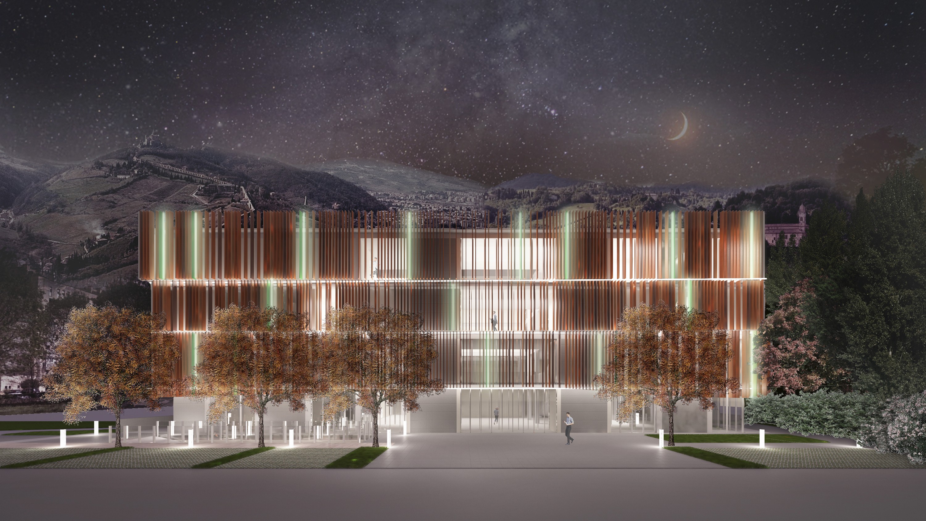 La facciata rimarca il concetto di modularità: le aperture, vetrate a tutt'altezza, hanno un passo regolare, mentre il brisesoleil crea una schermatura e un gioco di luci e ombre, diversificato in base all'orientamento. Questo sistema, proposto in diversi toni del color mattone come omaggio alla tradizione bolognese, è interrotto da alcuni elementi di colore verde, in linea con le case della comunità sul territorio bolognese. Su ogni livello e in base alle necessità o meno di schermare i raggi solari, questi elementi si infittiscono e/o si allontanano dalla facciata, creando su ogni piano un perimetro diverso e conferendo ulteriore dinamicità ai volumi. In versione serale, questi elementi prendono vita grazie alla presenza di led colorati che creano un gioco dinamico e divertente.