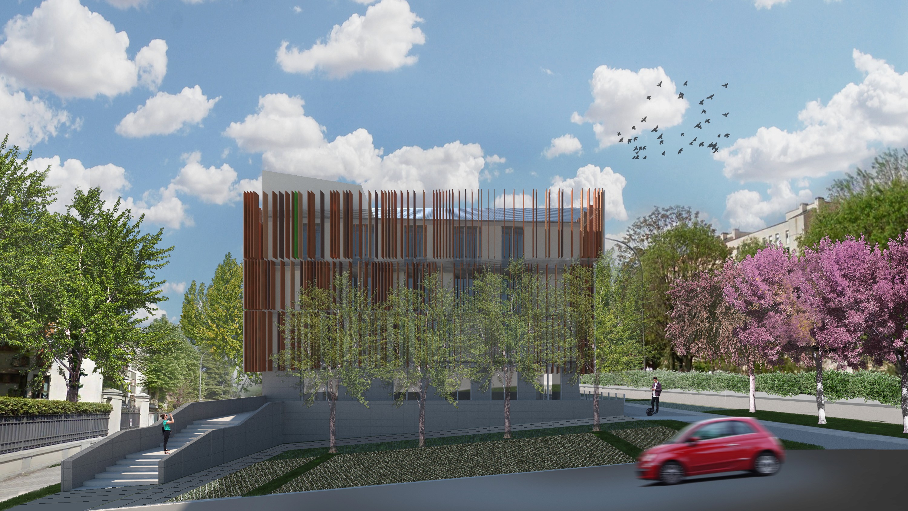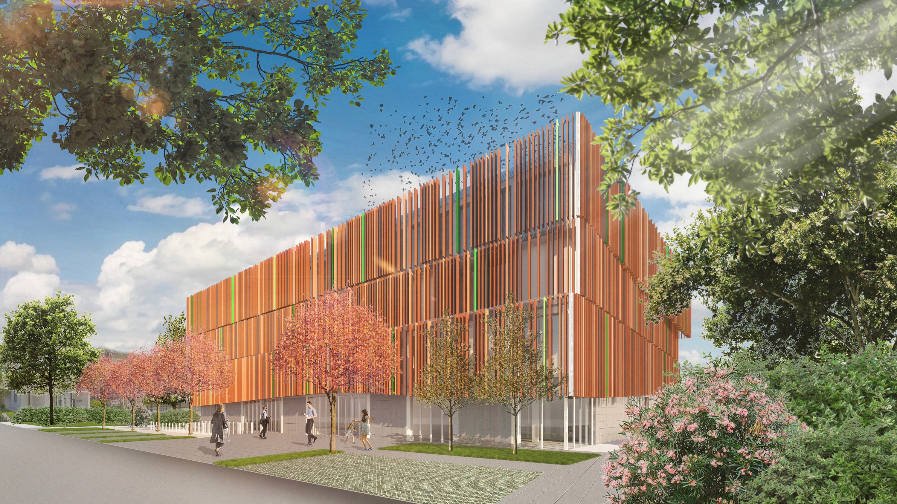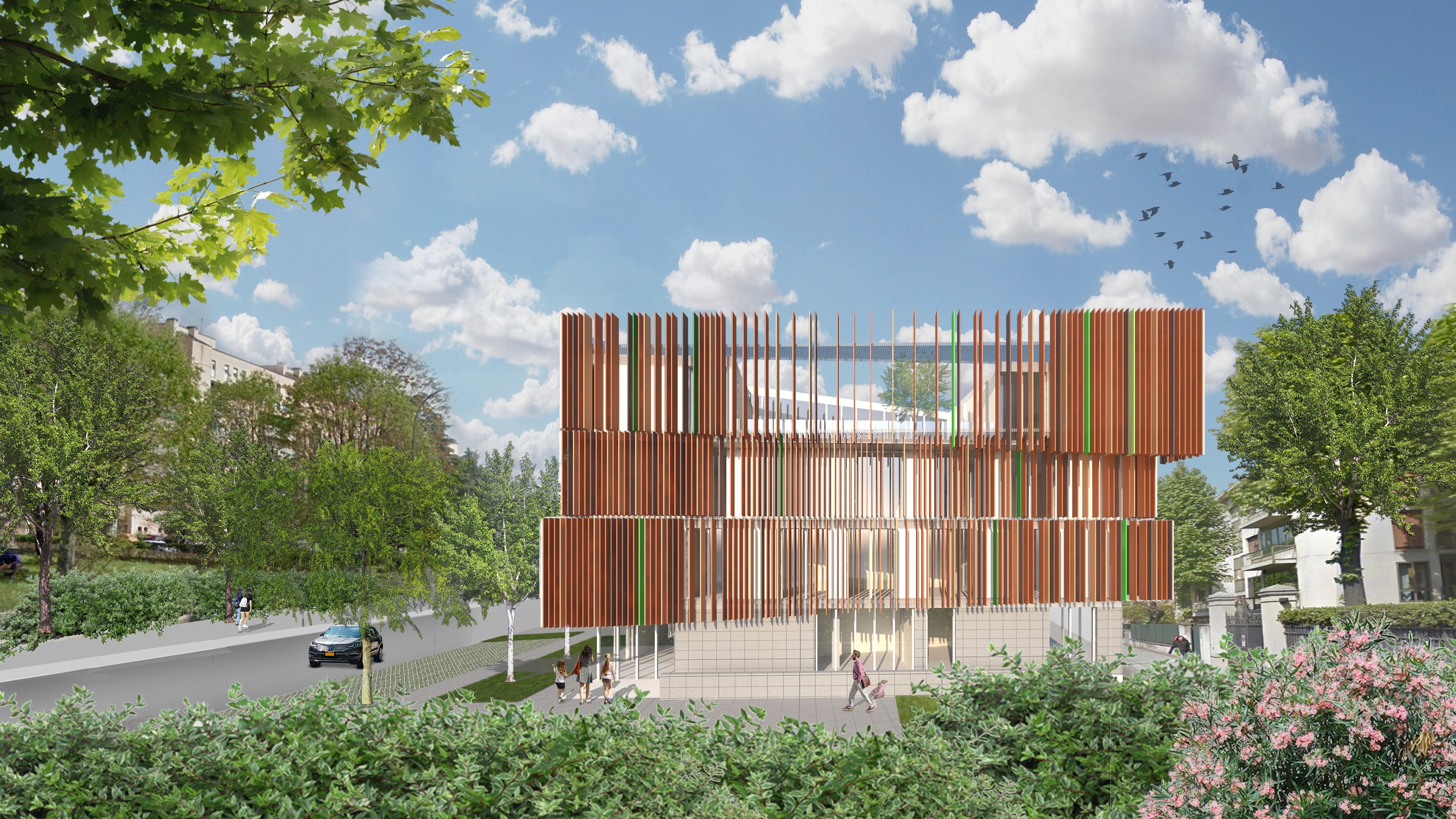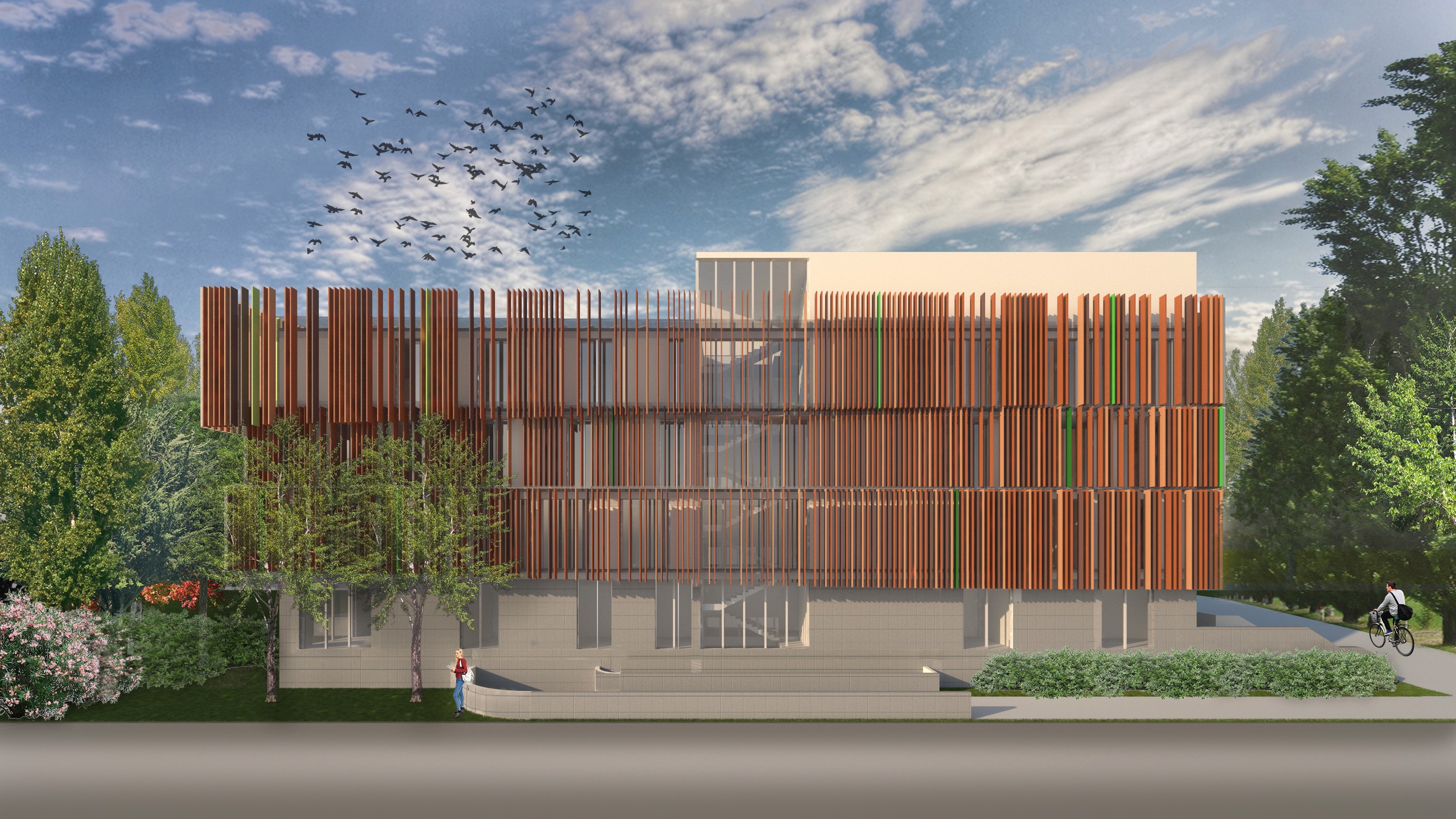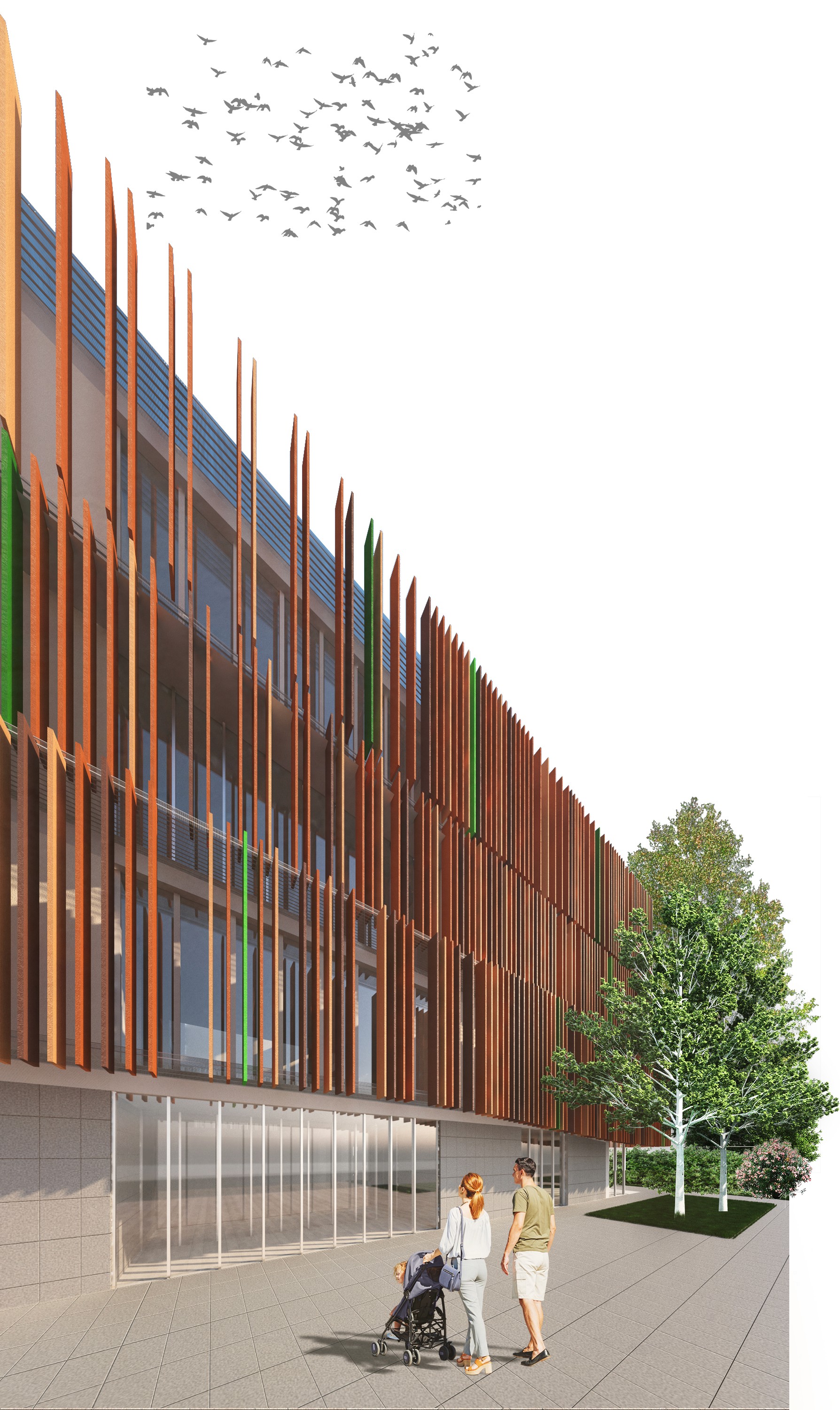 La copertura verde, insieme alle corti interne piantumate, contribuisce a mitigare l’impatto visivo e ambientale del nuovo edificio, assicurando al contempo una dotazione adeguata di spazi verdi a beneficio degli utenti.