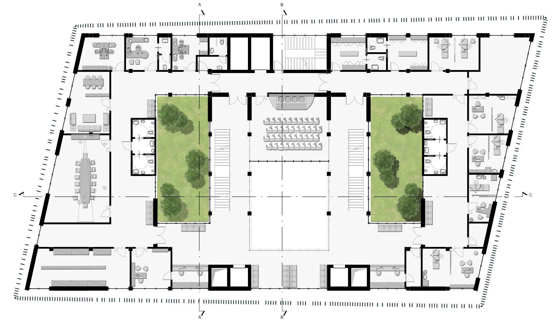La proposta progettuale prevede un edificio compatto, conformato secondo la geometria irregolare del lotto, di forma quadrilatera e tendenzialmente a parallelogramma. L’organismo edilizio si articola attorno a corti interne ed è distribuito su quattro livelli fuori terra e un piano interrato.