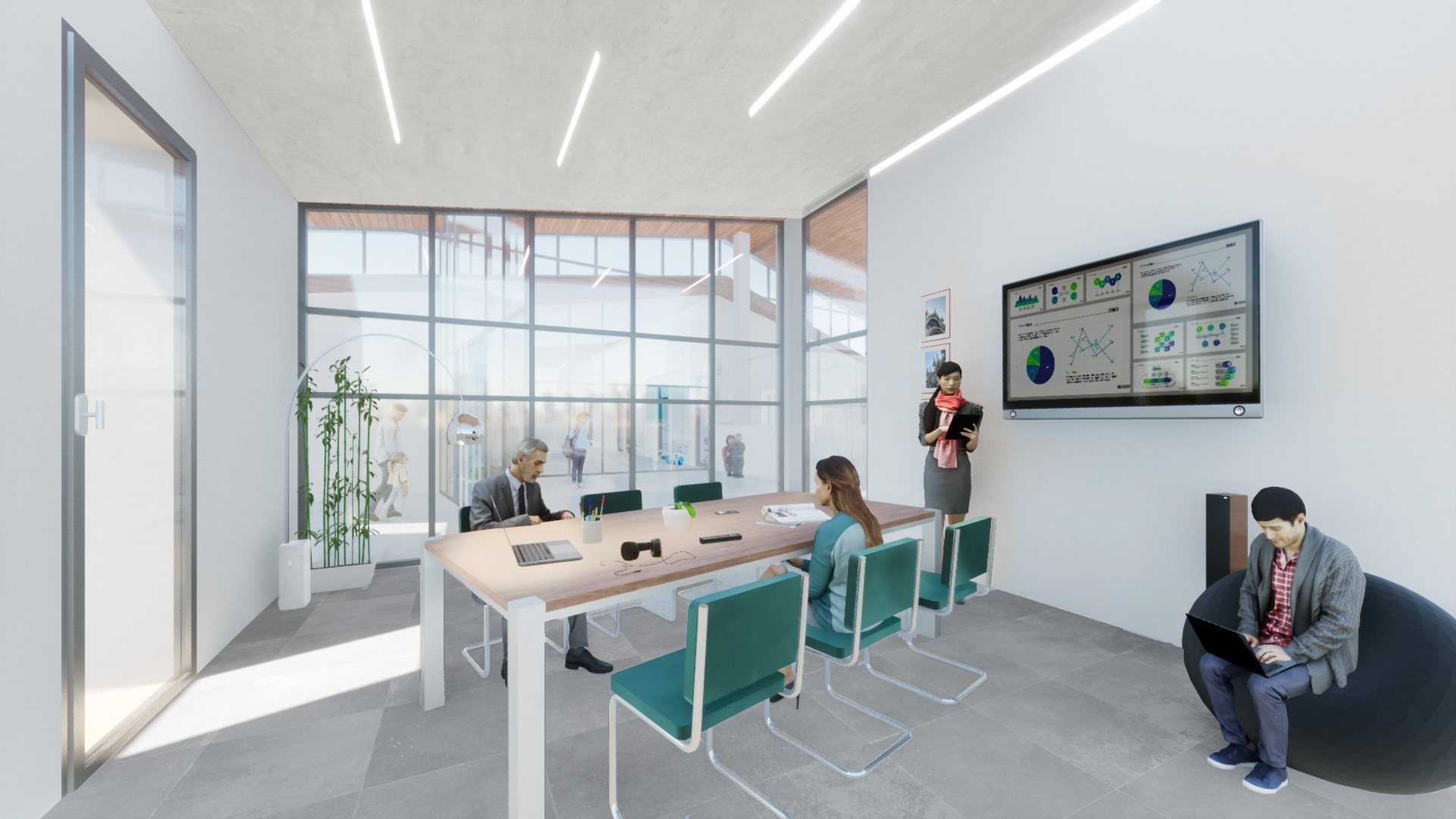 L’edificio comunale adiacente è dominato da una sala congressi vetrata di forma quadrata, con copertura verde inclinata a falda unica. La scelta delle coperture a falde si armonizza con il contesto, caratterizzato da edifici da uno a tre piani, e semplifica il deflusso delle acque meteoriche.