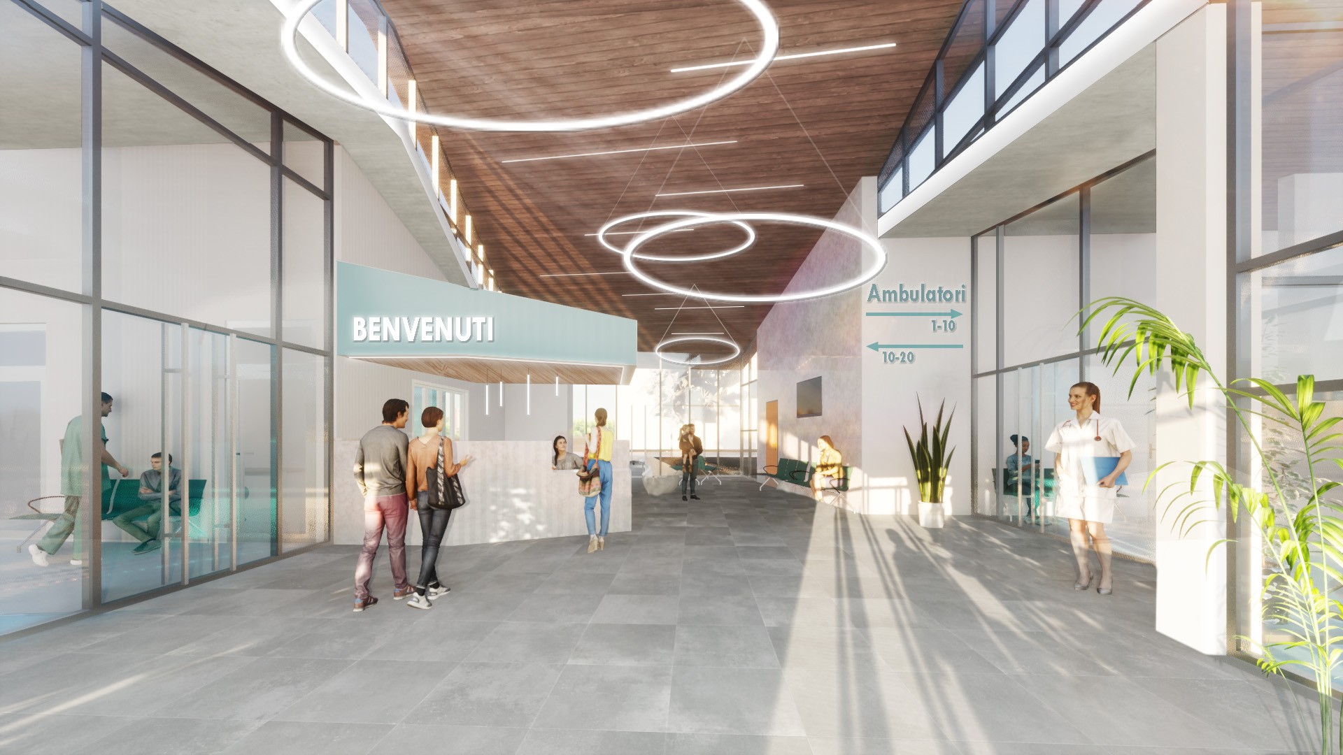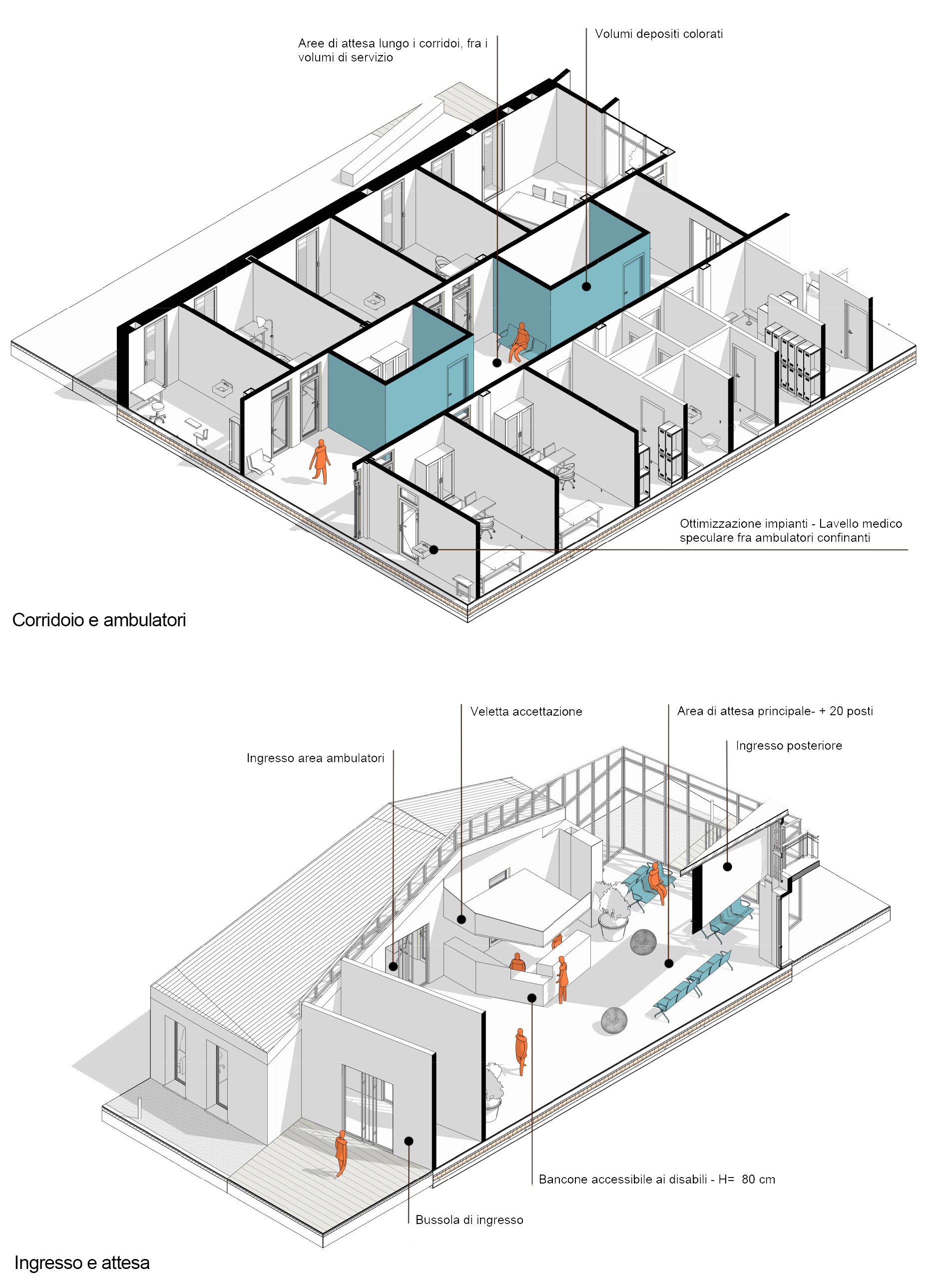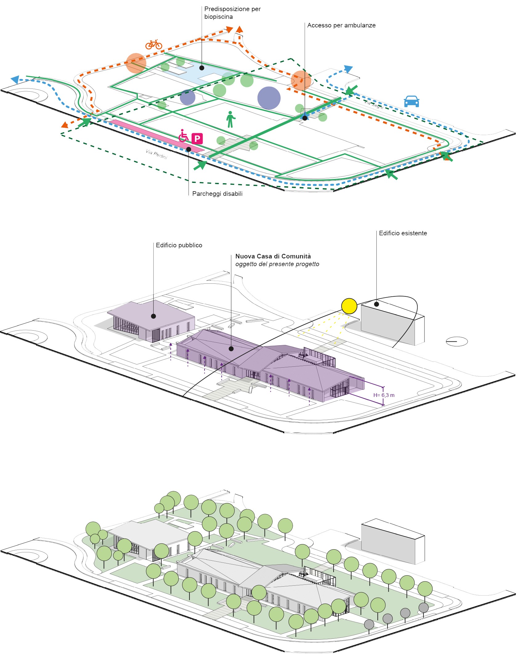 L’edificio destinato a Casa di Comunità è composto da un corpo centrale di ingresso/accoglienza e due ali sfalsate ma quasi simmetriche, destinate ad ambulatori generici, diagnostica, specialistica, studi medici, servizi igienici e locali tecnici. La disposizione planimetrica garantisce un’ottima illuminazione naturale degli ambienti, disposti longitudinalmente. Ingressi secondari sono collocati sui lati Nord e Sud.