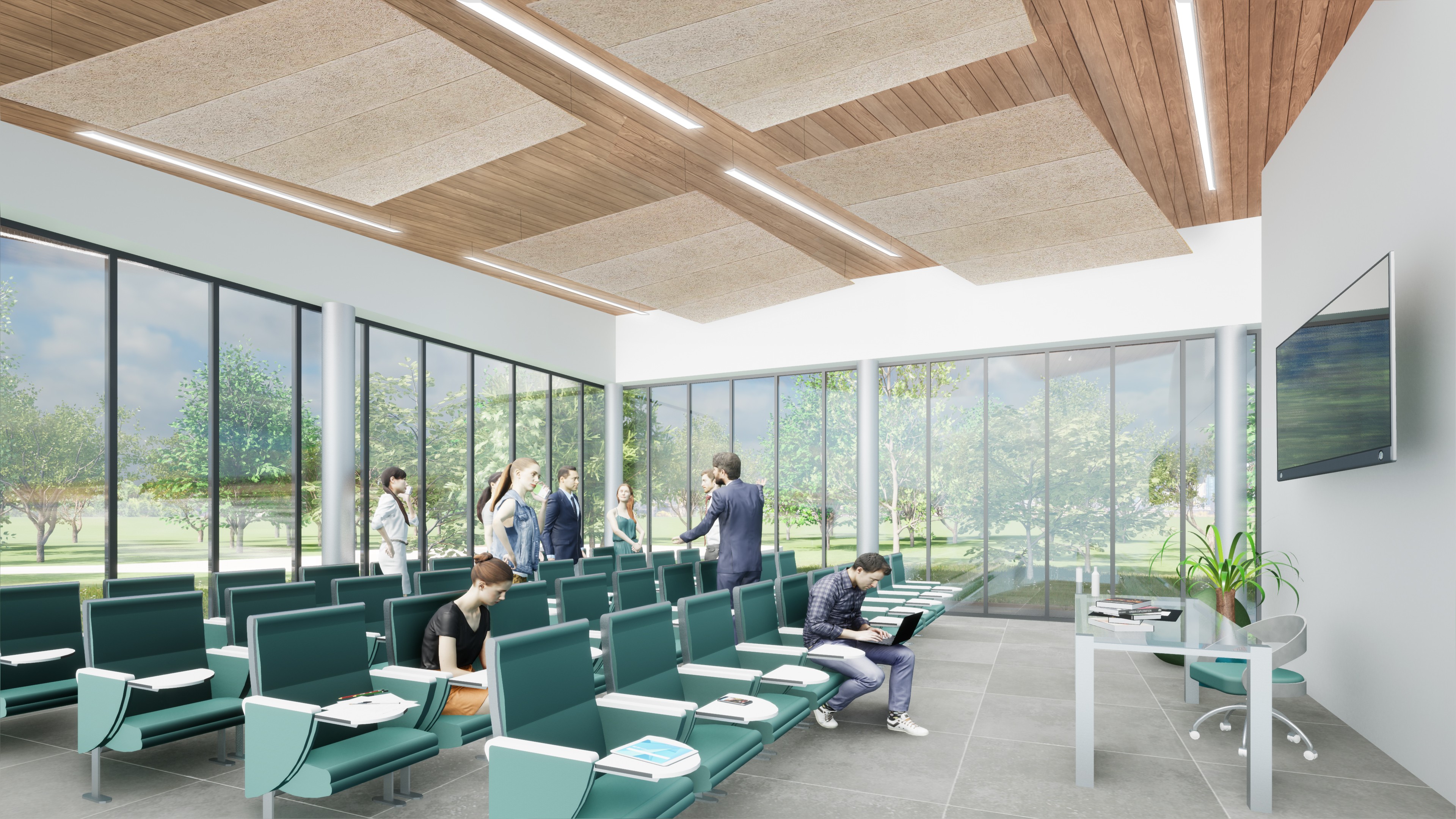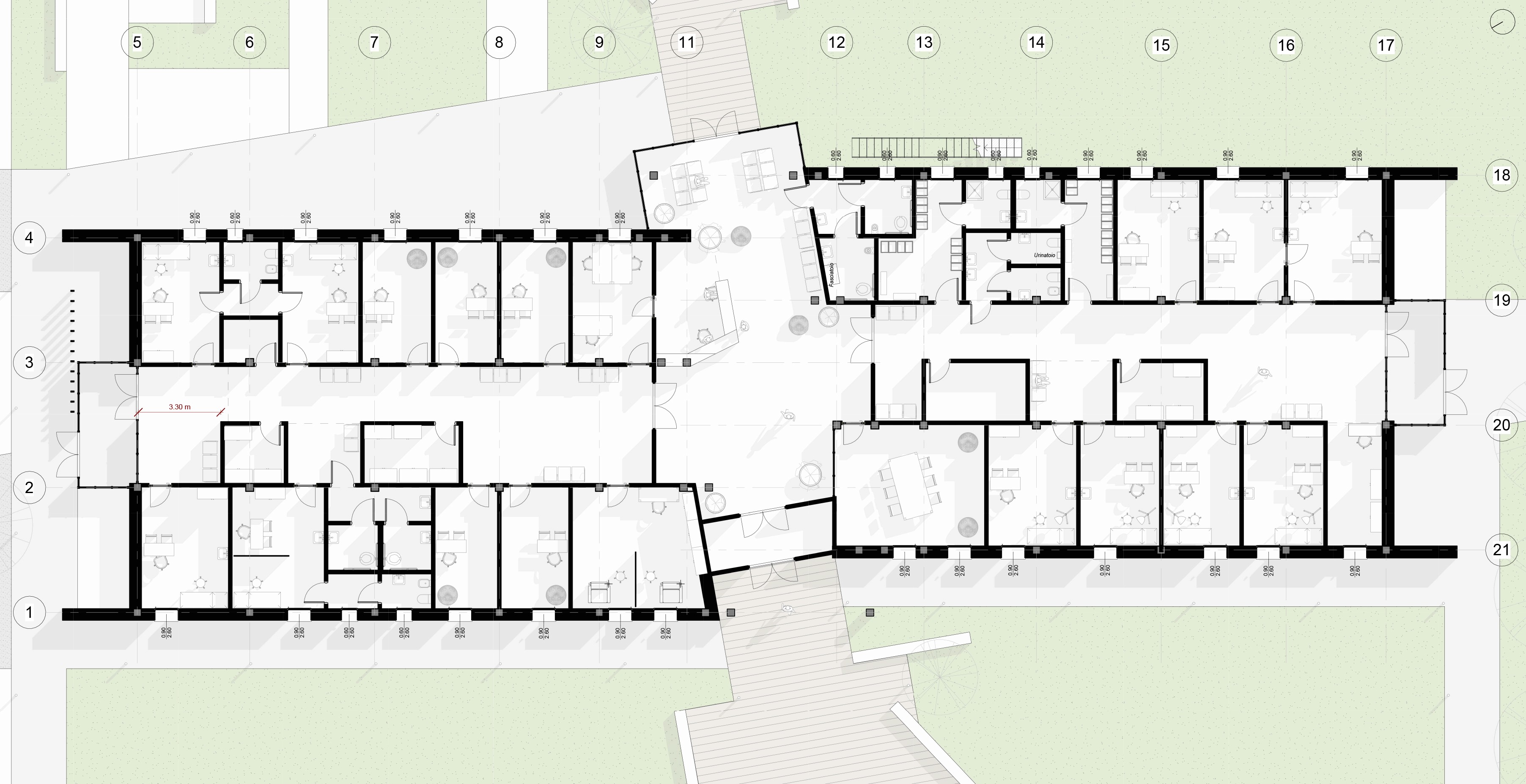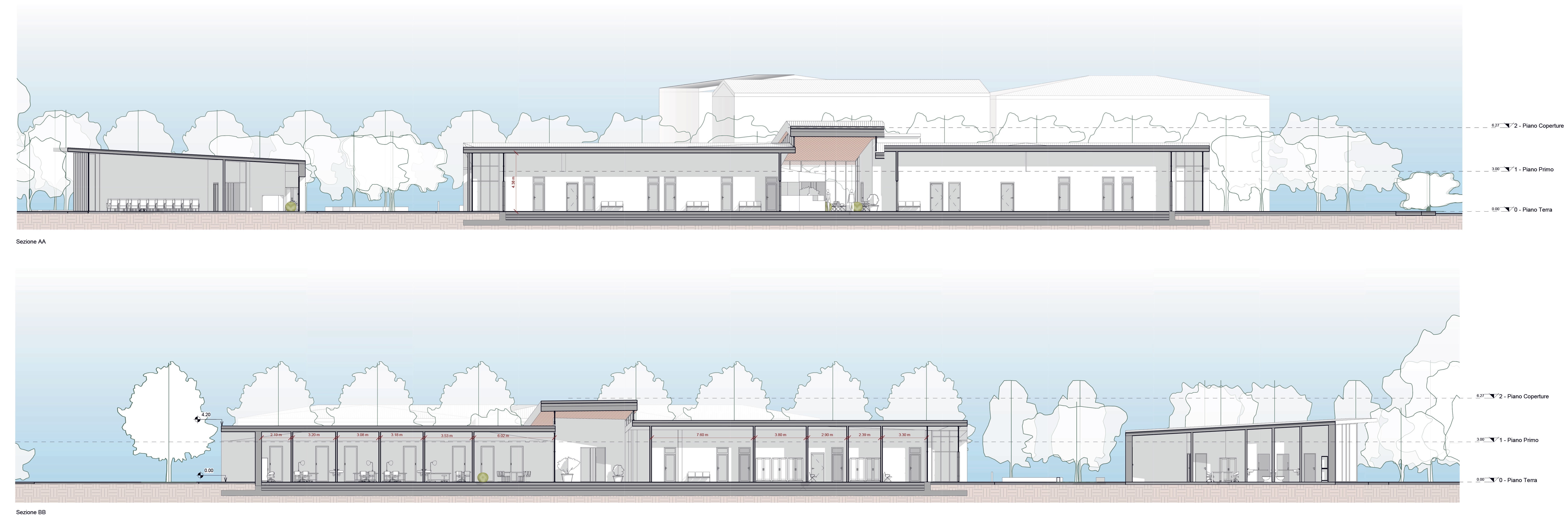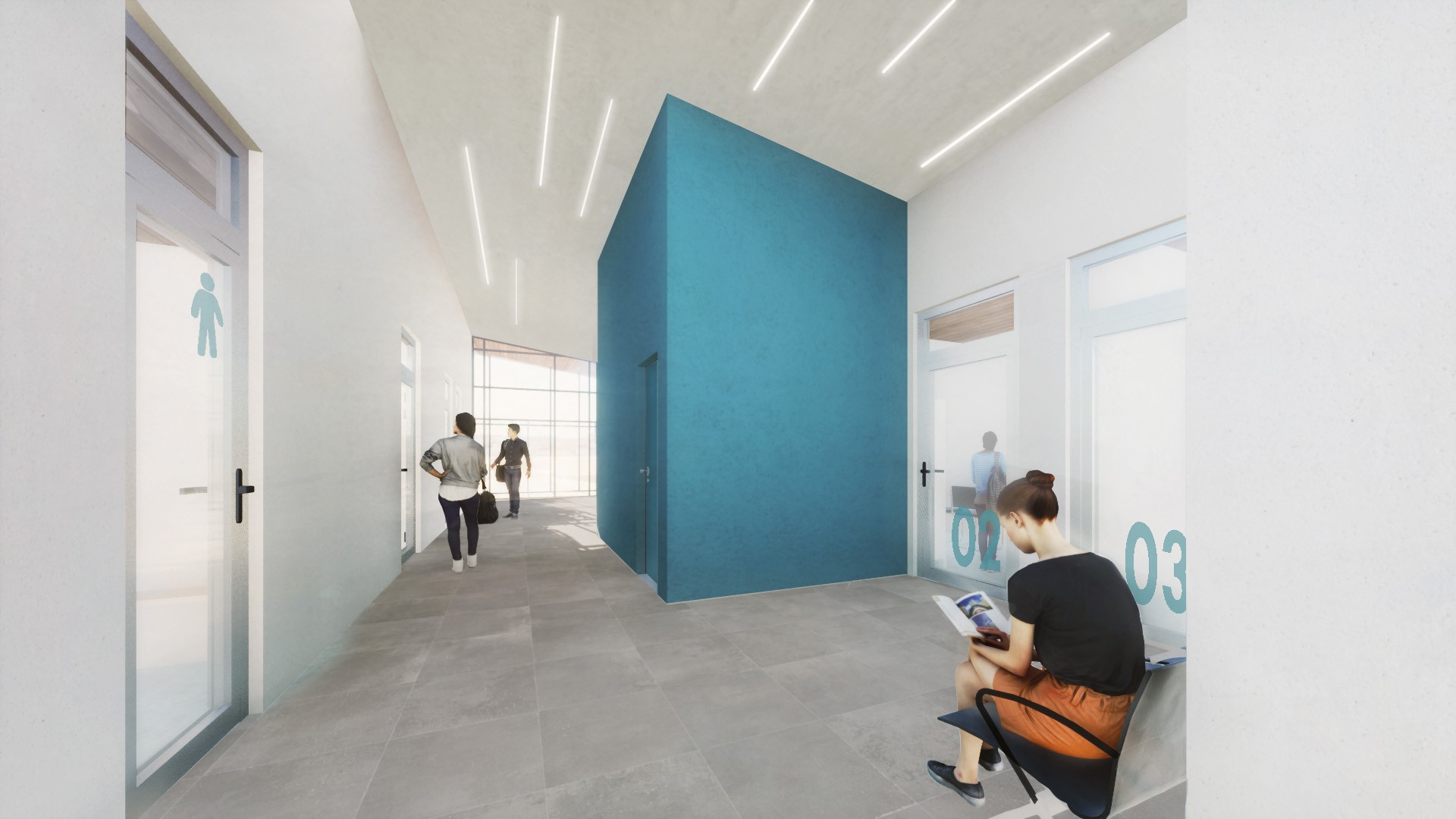 L’edificio destinato a Casa di Comunità è composto da un corpo centrale di ingresso/accoglienza e due ali sfalsate ma quasi simmetriche, destinate ad ambulatori generici, diagnostica, specialistica, studi medici, servizi igienici e locali tecnici. La disposizione planimetrica garantisce un’ottima illuminazione naturale degli ambienti, disposti longitudinalmente. Ingressi secondari sono collocati sui lati Nord e Sud.