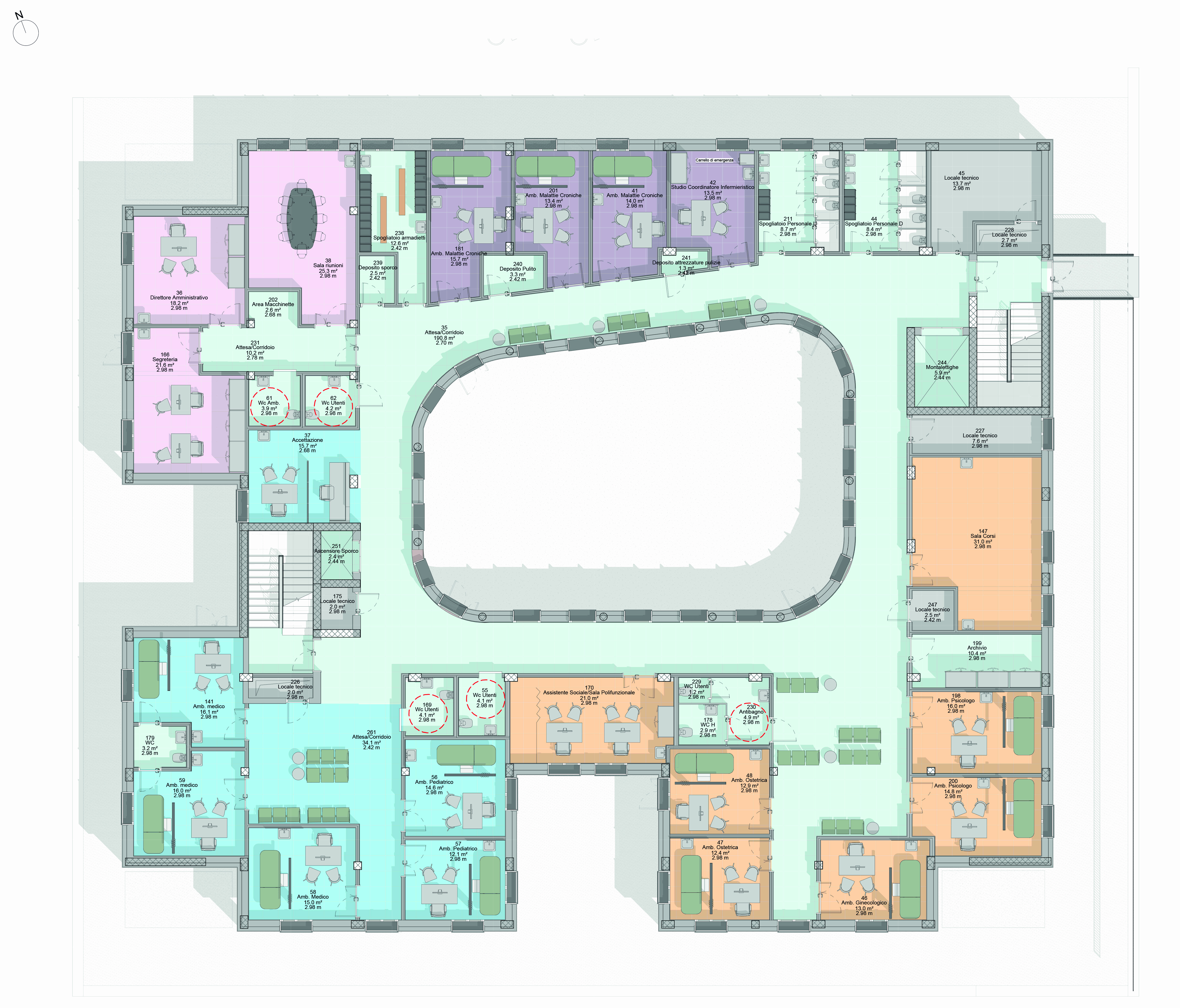 All’ingresso, una hall luminosa accoglie i visitatori con bancone, sedute per l’attesa e il servizio CUP visibile e facilmente accessibile. Gli ambulatori sono distribuiti in modo ordinato su tutti i piani e raggruppati per funzione: dalla medicina generale ai consultori, dalle vaccinazioni alla medicina legale. I percorsi interni garantiscono fluidità e orientamento intuitivo, mentre quelli esterni offrono continuità, sicurezza e comfort. Gli spazi destinati al personale, come spogliatoi e depositi, sono collocati in posizioni strategiche per garantire riservatezza e praticità operativa.