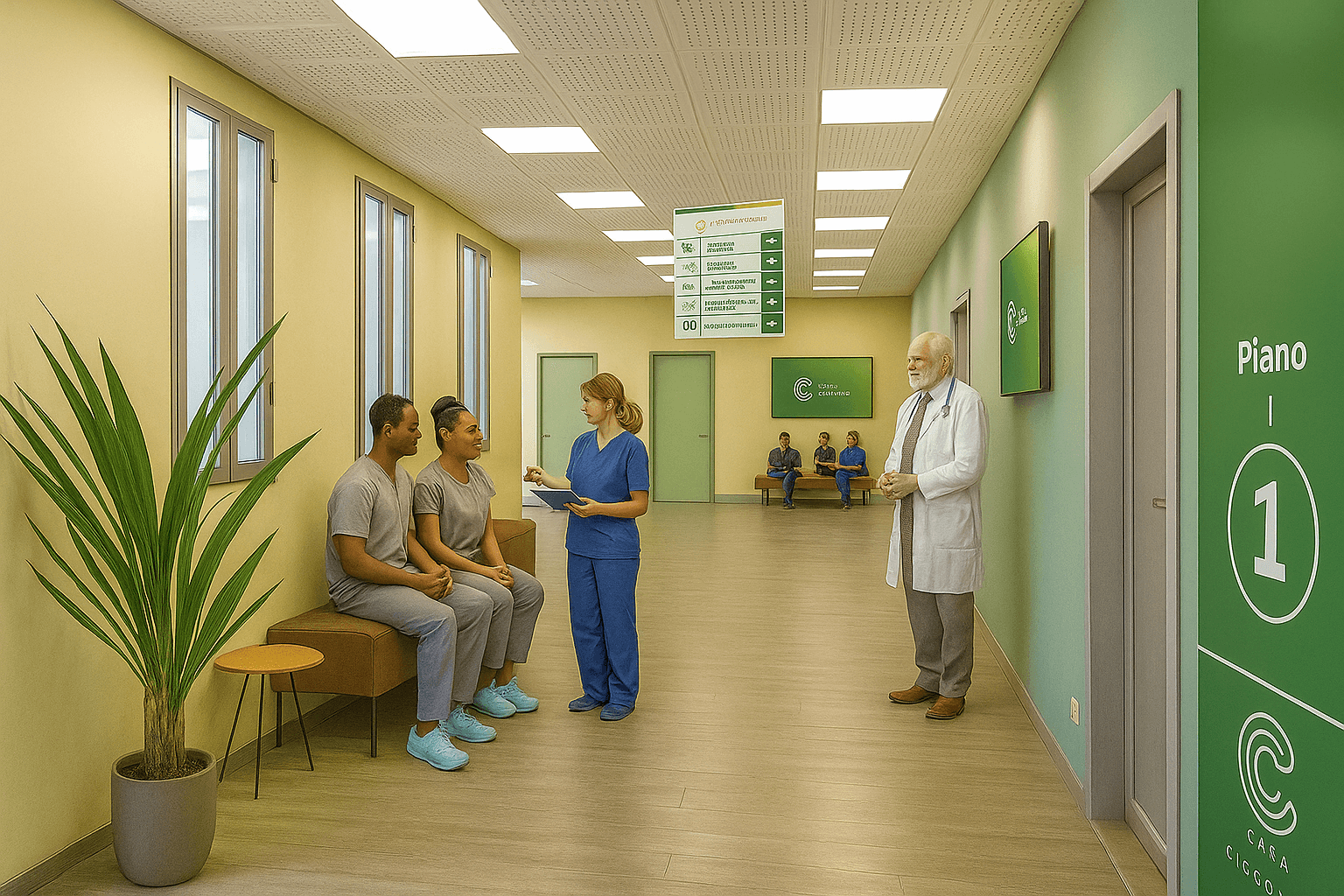 La distribuzione interna della struttura è progettata per garantire chiarezza, efficienza e comfort. La planimetria, compatta e razionale, organizza i reparti secondo una logica modulare che facilita l’individuazione dei servizi e l’eventuale adattamento futuro.