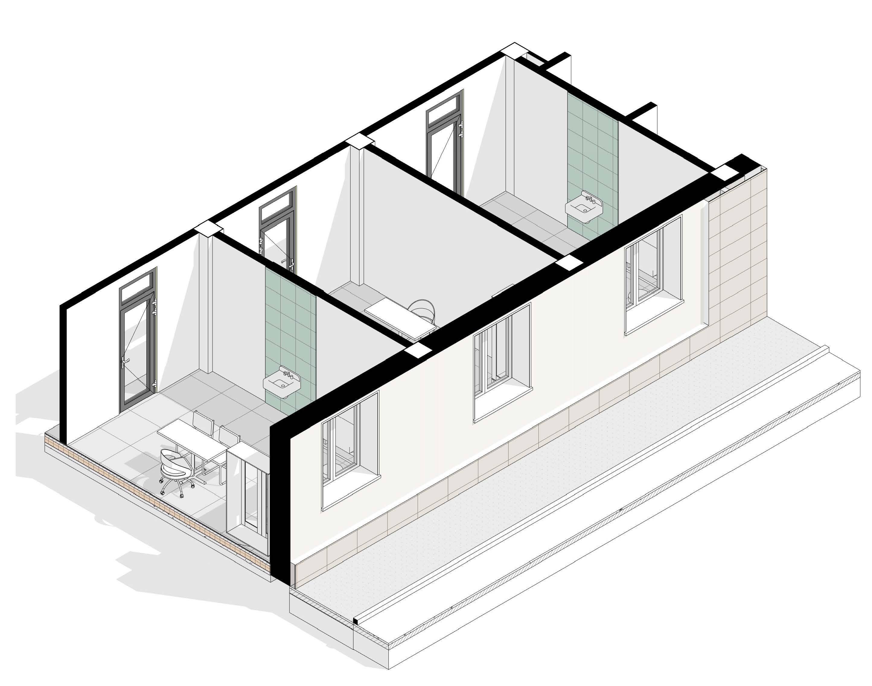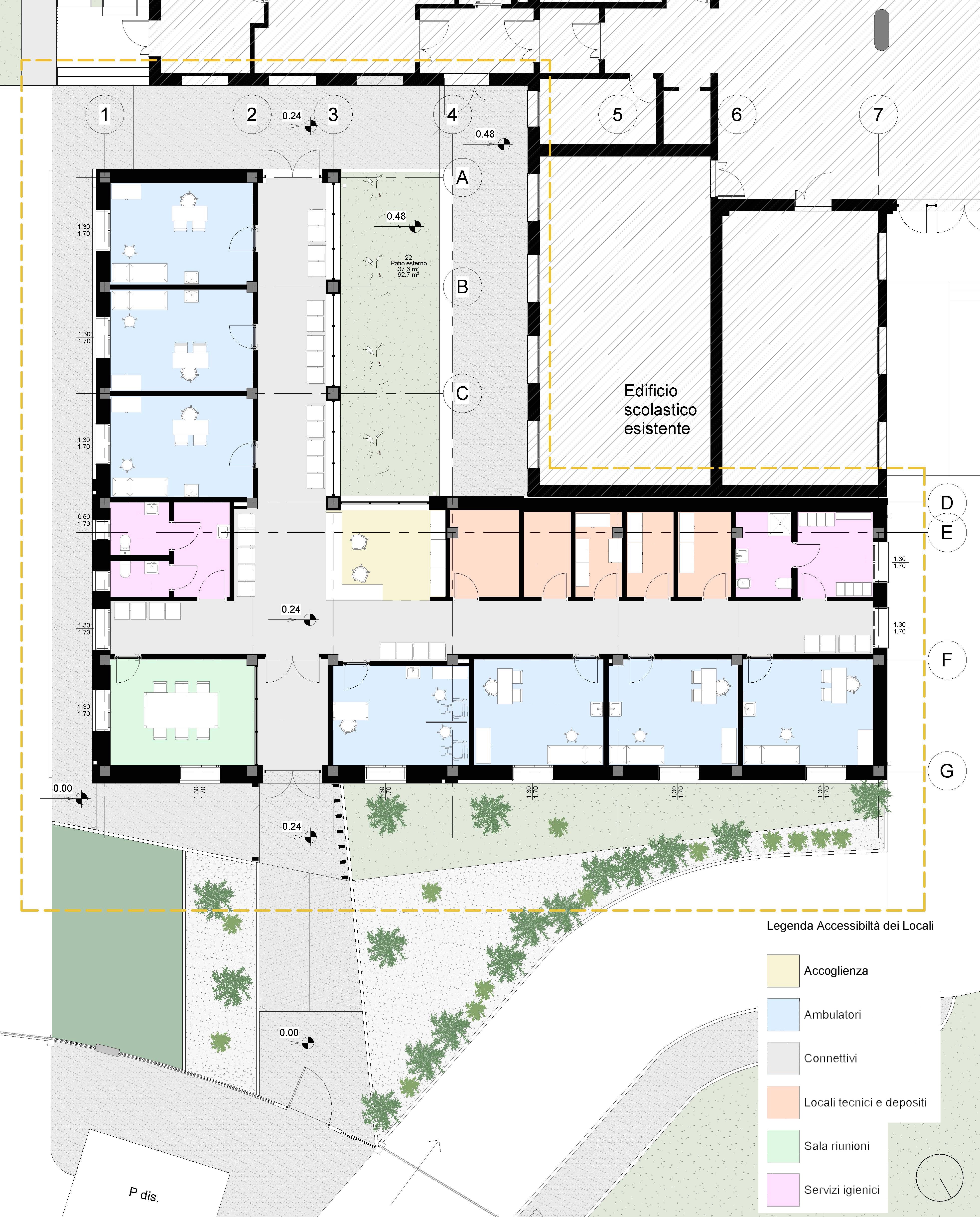 La planimetria è caratterizzata da modularità e razionalità, così come la scansione delle facciate, a basso impatto economico ma in armonia. Per gli spazi interni è studiata una palette di colori sui toni caldi del legno e del verde, sia per i complementi di arredo che per i rivestimenti a protezione posteriore del lavabo negli ambulatori.