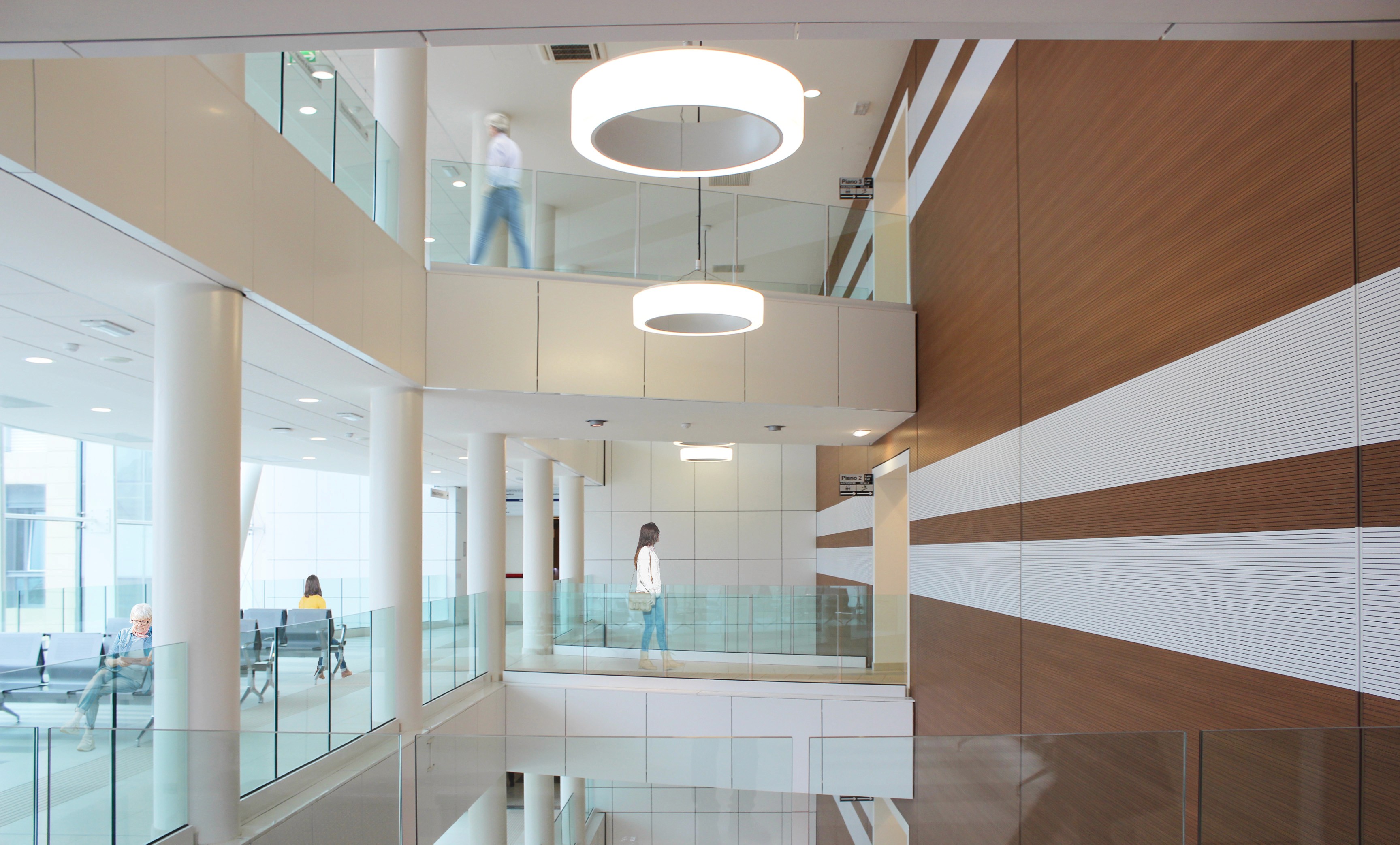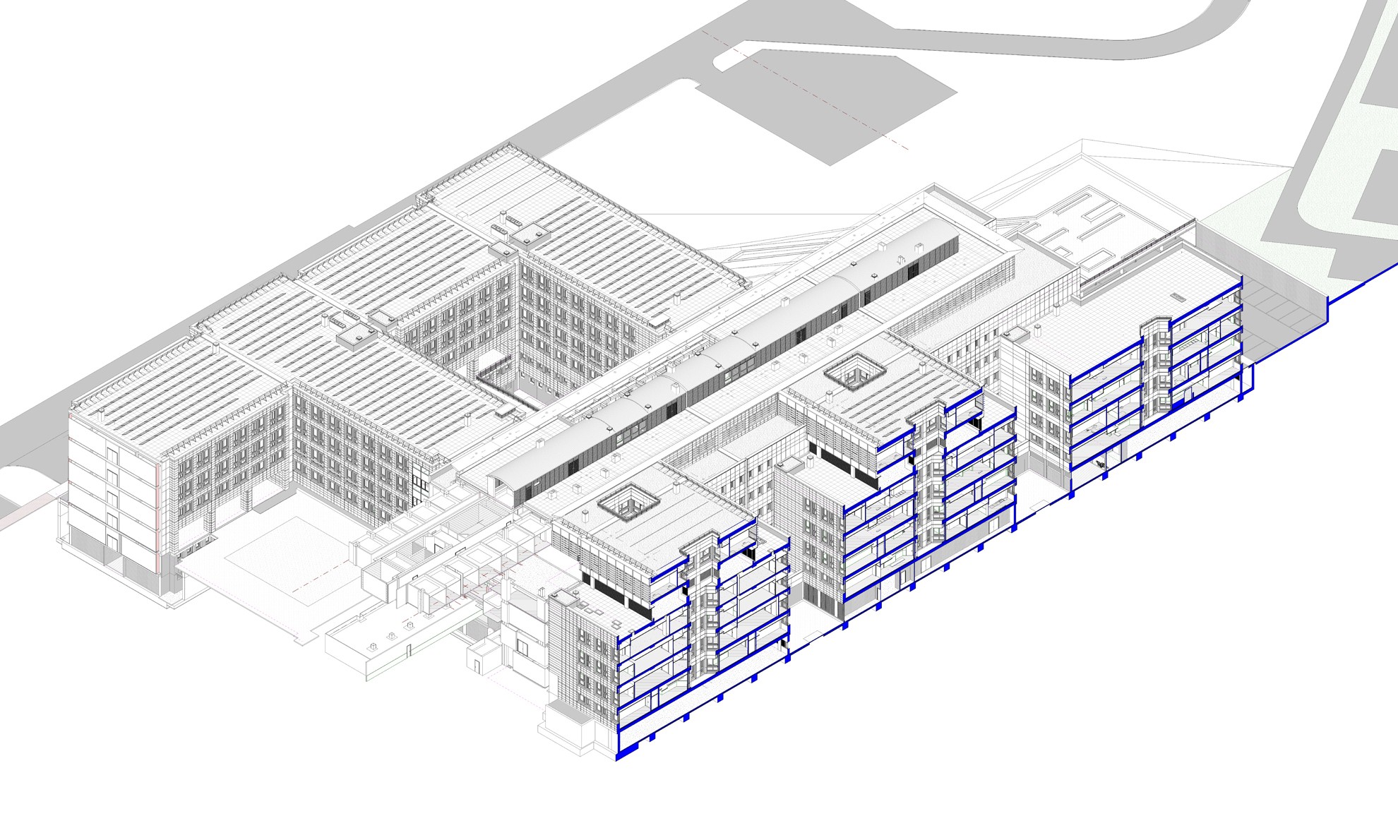 Dal punto di vista planimetrico, l'edificio è suddiviso in tre macro-porzioni funzionali, collegate da percorsi orizzontali: una piastra tecnologica sul lato nord, gli spazi ambulatoriali e comuni nella parte centrale, e le degenze sul lato sud.