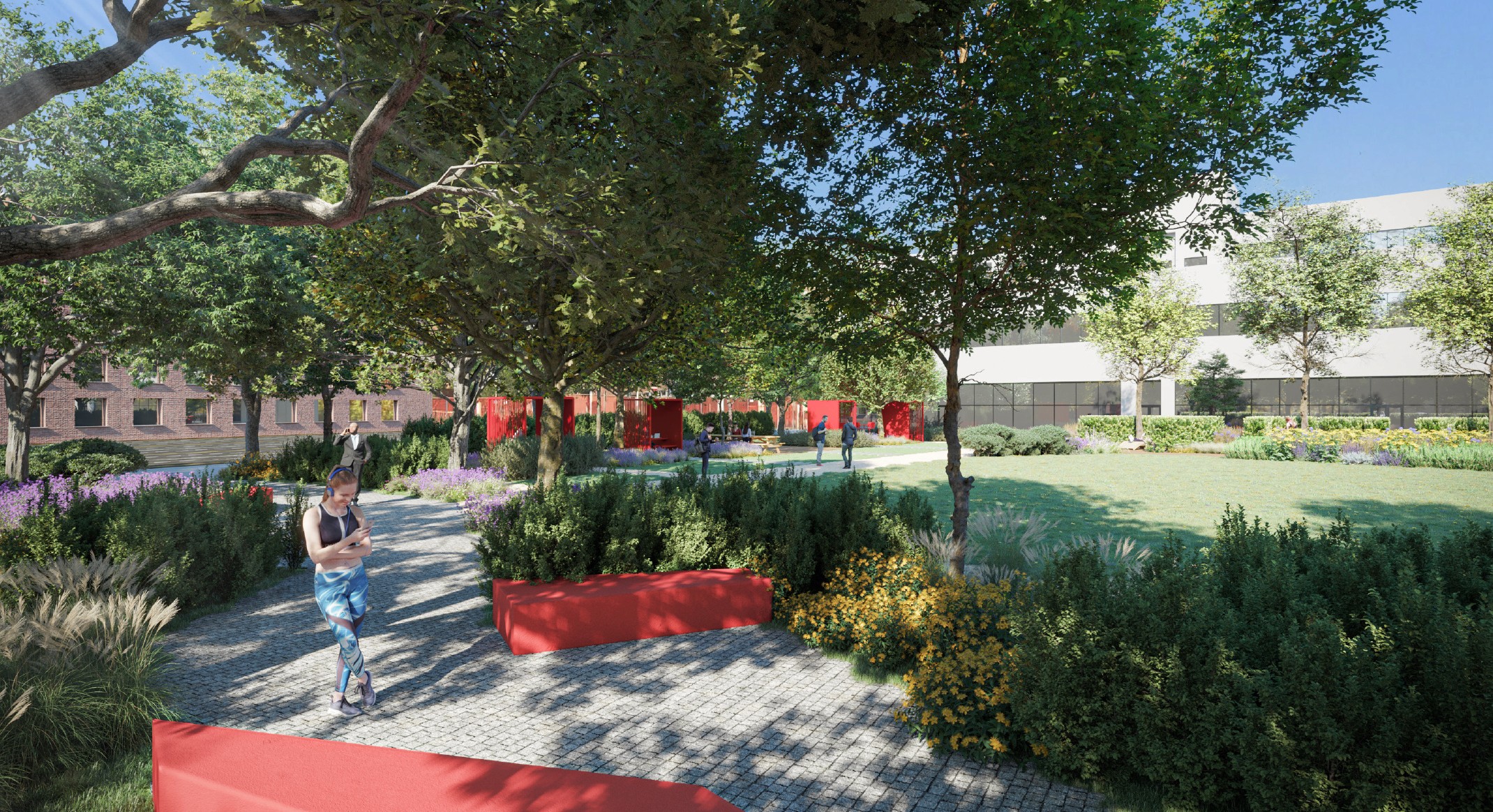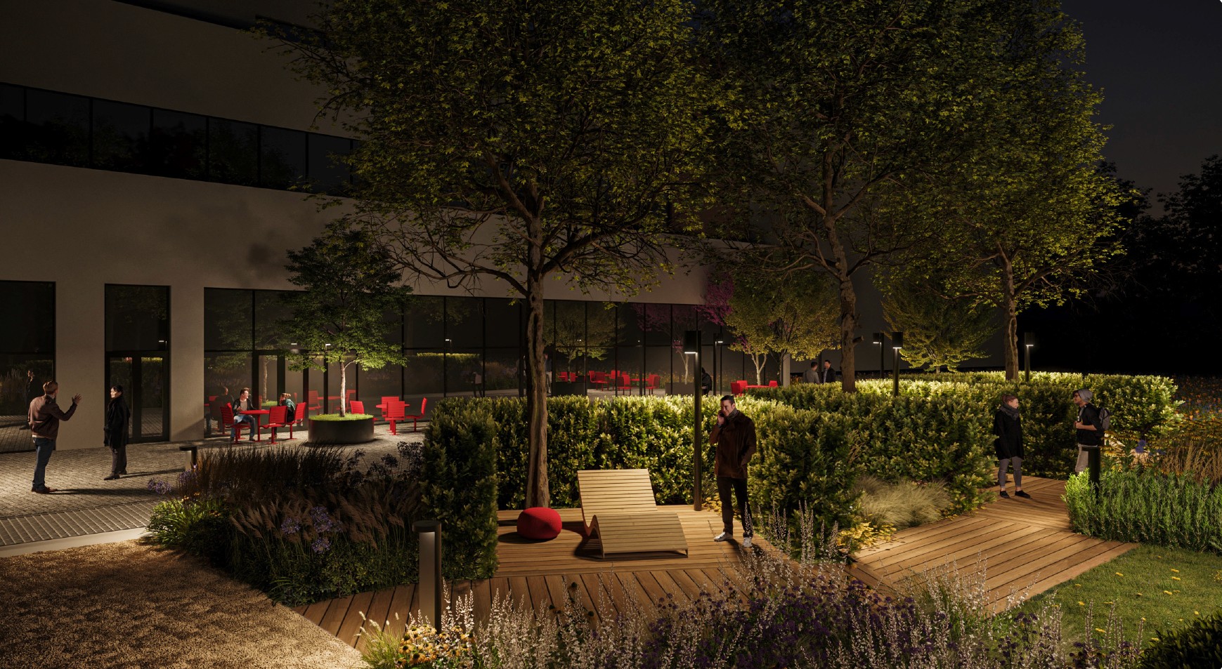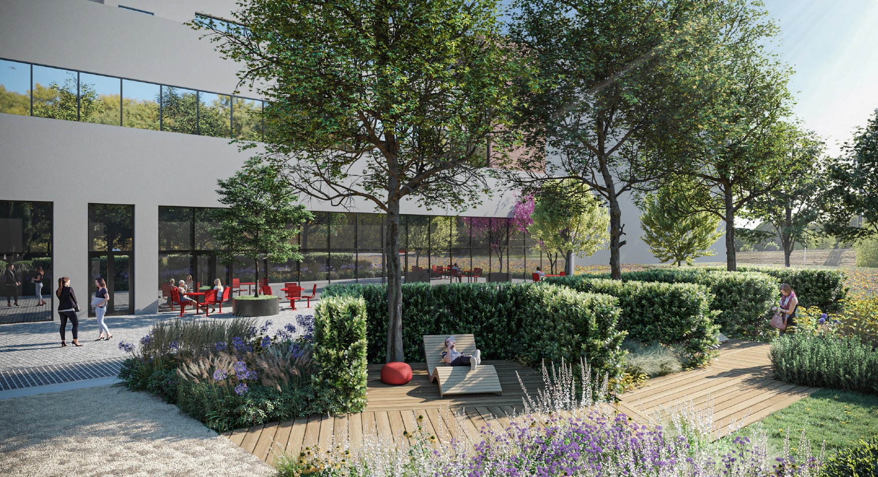 Il progetto delle aree esterne, così come proposto in gara e come ingegnerizzato in seguito, si pone due obiettivi principali: dotare il nuovo edificio di un ambiente esterno ricco, stimolante e piacevole e mettere in atto una strategia di connessioni urbane che rendano l'area aperta alle opportunità offerte dal territorio circostante.