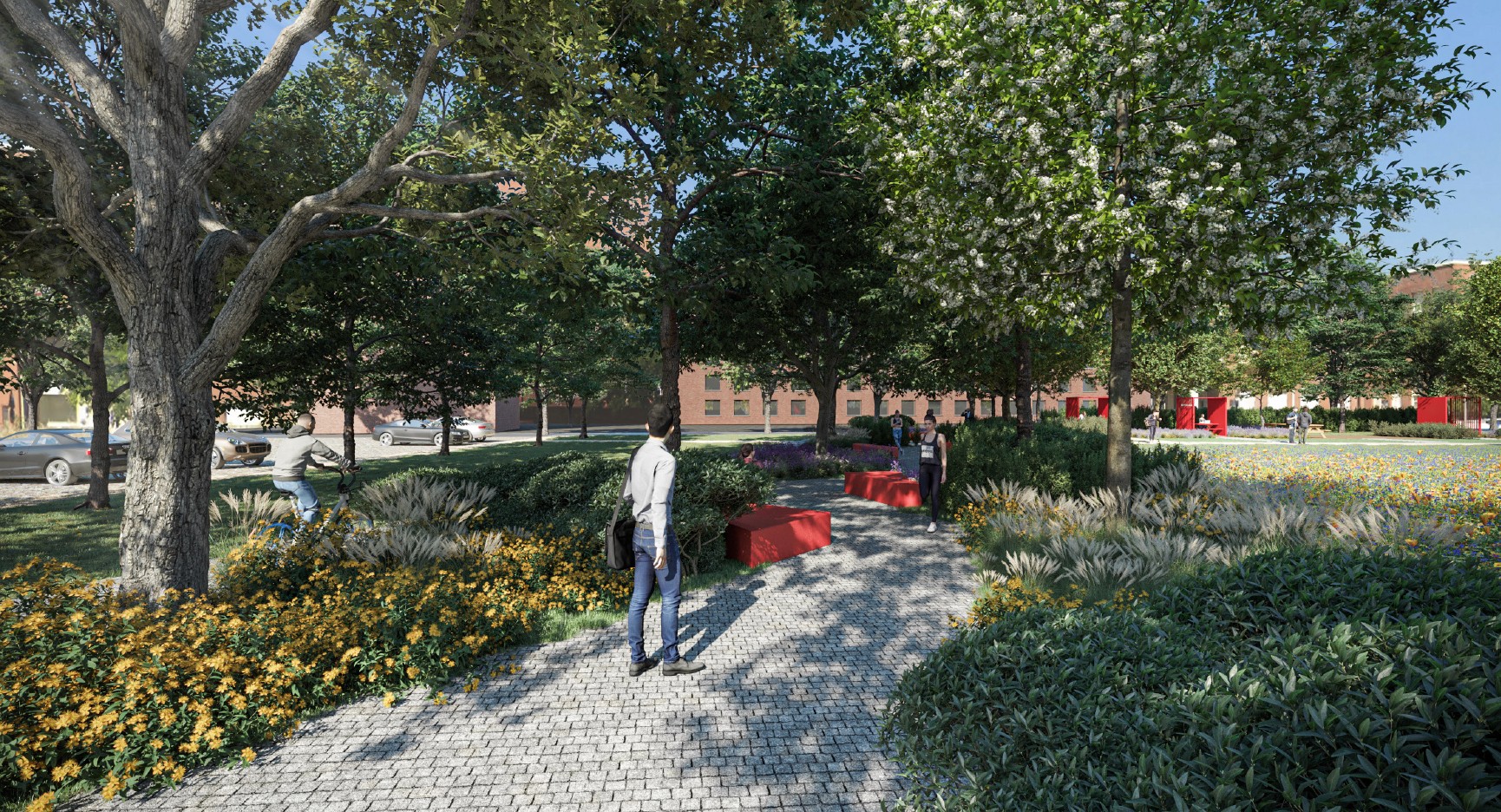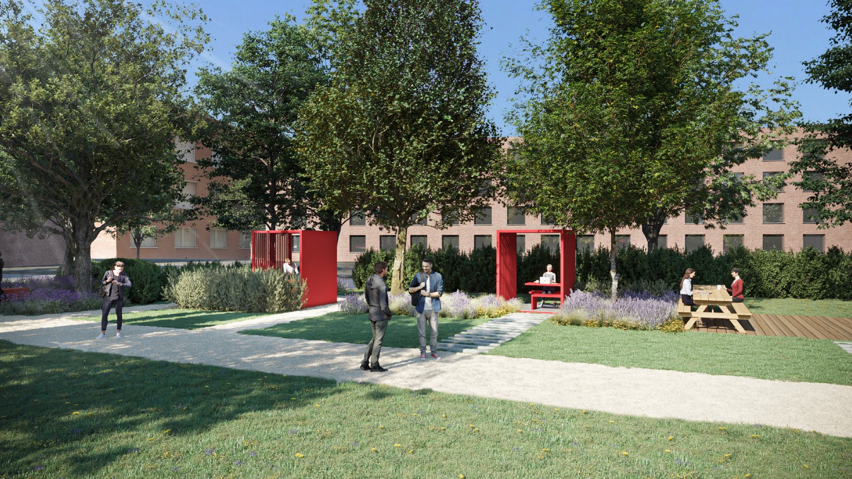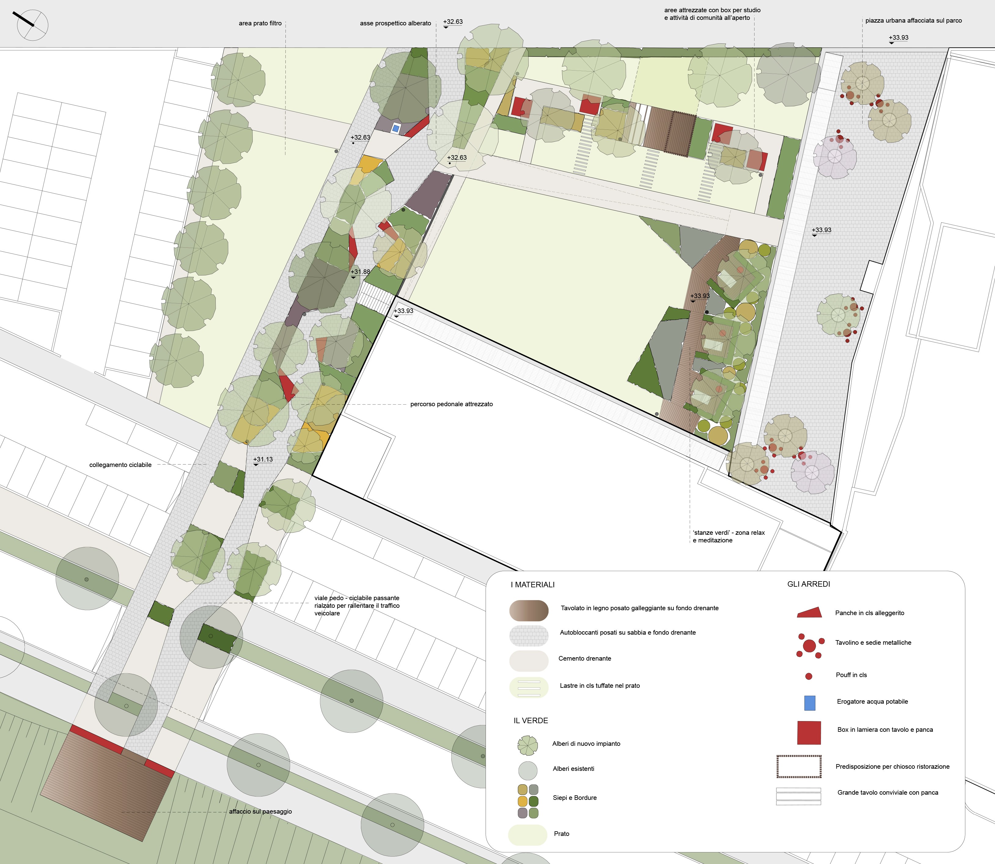 Il verde diventa un elemento di valore e si arricchisce di nuove funzioni, vivibili e non meramente decorative: postazioni di supporto psicologico, un chiosco, varie sedute e box ricreativi si innestano fra le varie essenze diventando naturalmente parte di un unico sistema. Seguendo questo principio, il verde accompagna il percorso dello studente anche all'interno: il vano scala ‘’centrale’’ al piano terra e primo, avrà un rivestimento in verde stabilizzato, per mantenere un dialogo con il giardino.
