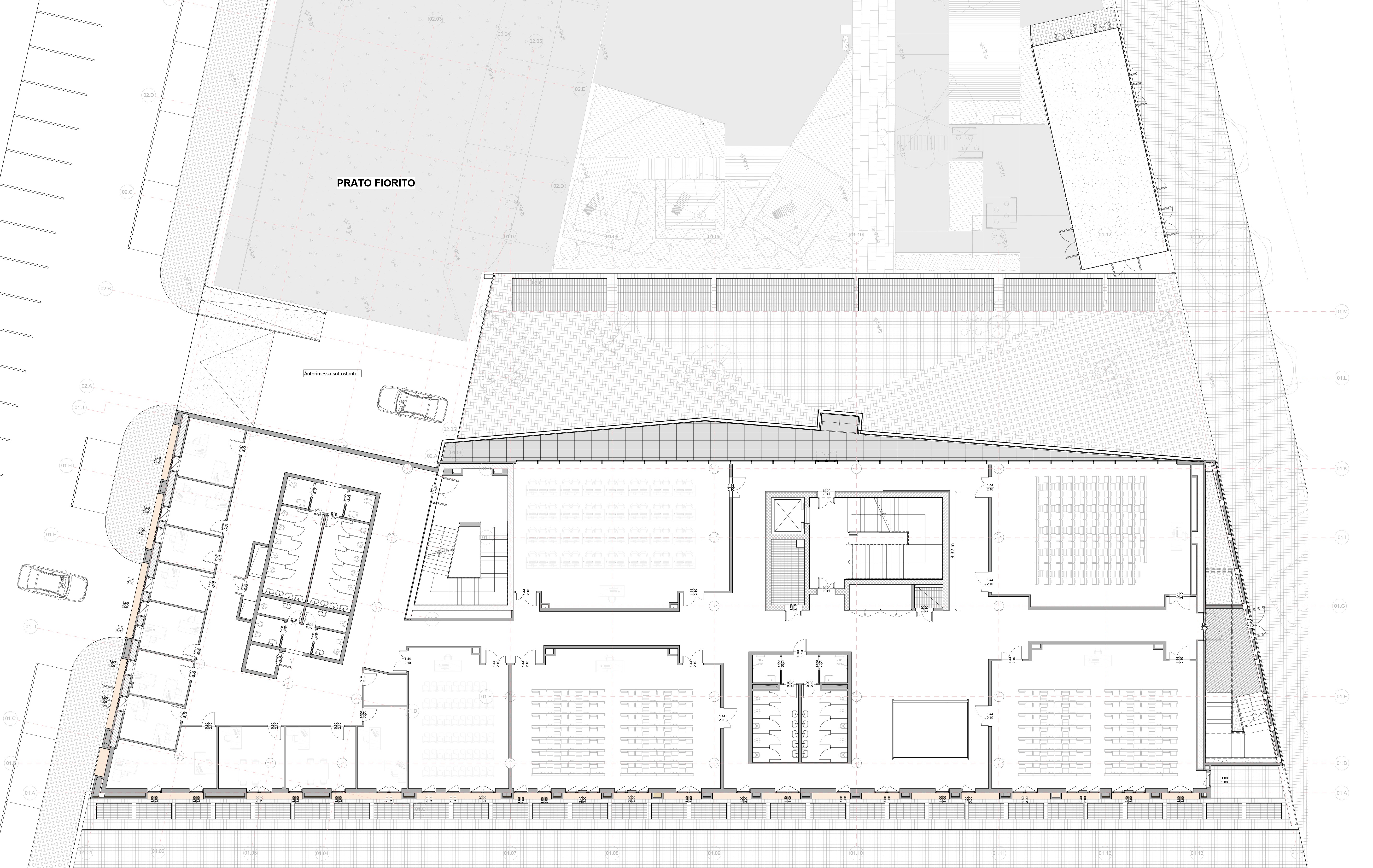 Il piano terra, adibito in parte ad uffici/segreteria e in parte a funzioni didattiche, presenta due fronti di accesso, a nord dal parco e a sud dalla esistente piazza Sciascia.