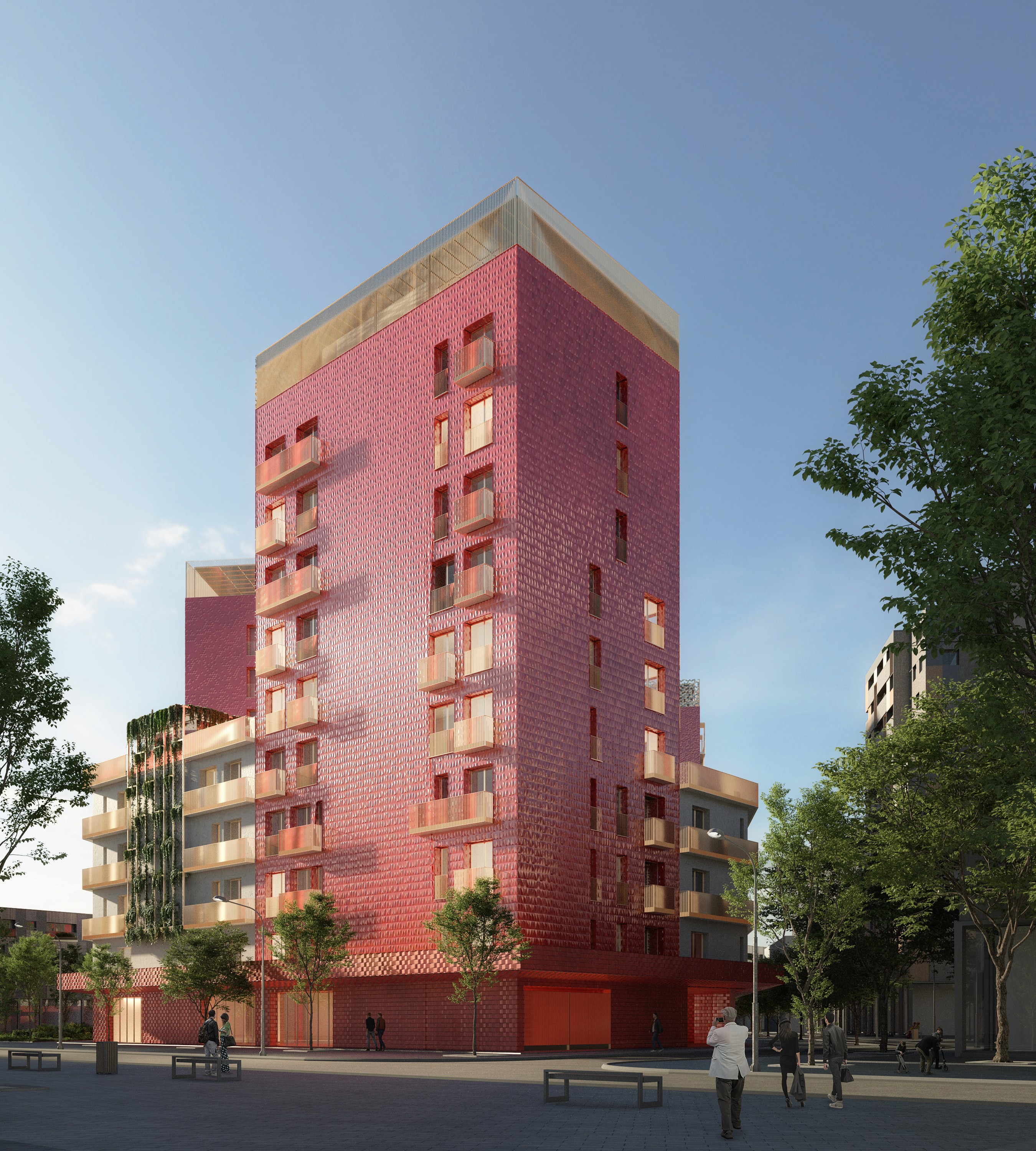 Le facciate reinterpretano il concetto di ''rosso bologna'' attraverso l'uso di una piastrella dalle geometria irregolare, in alternativa al mattone. Questo materiale, con finitura lucida, crea un interessante gioco di riflessi e colori che caratterizza e impreziosisce l'involucro delle torri.
