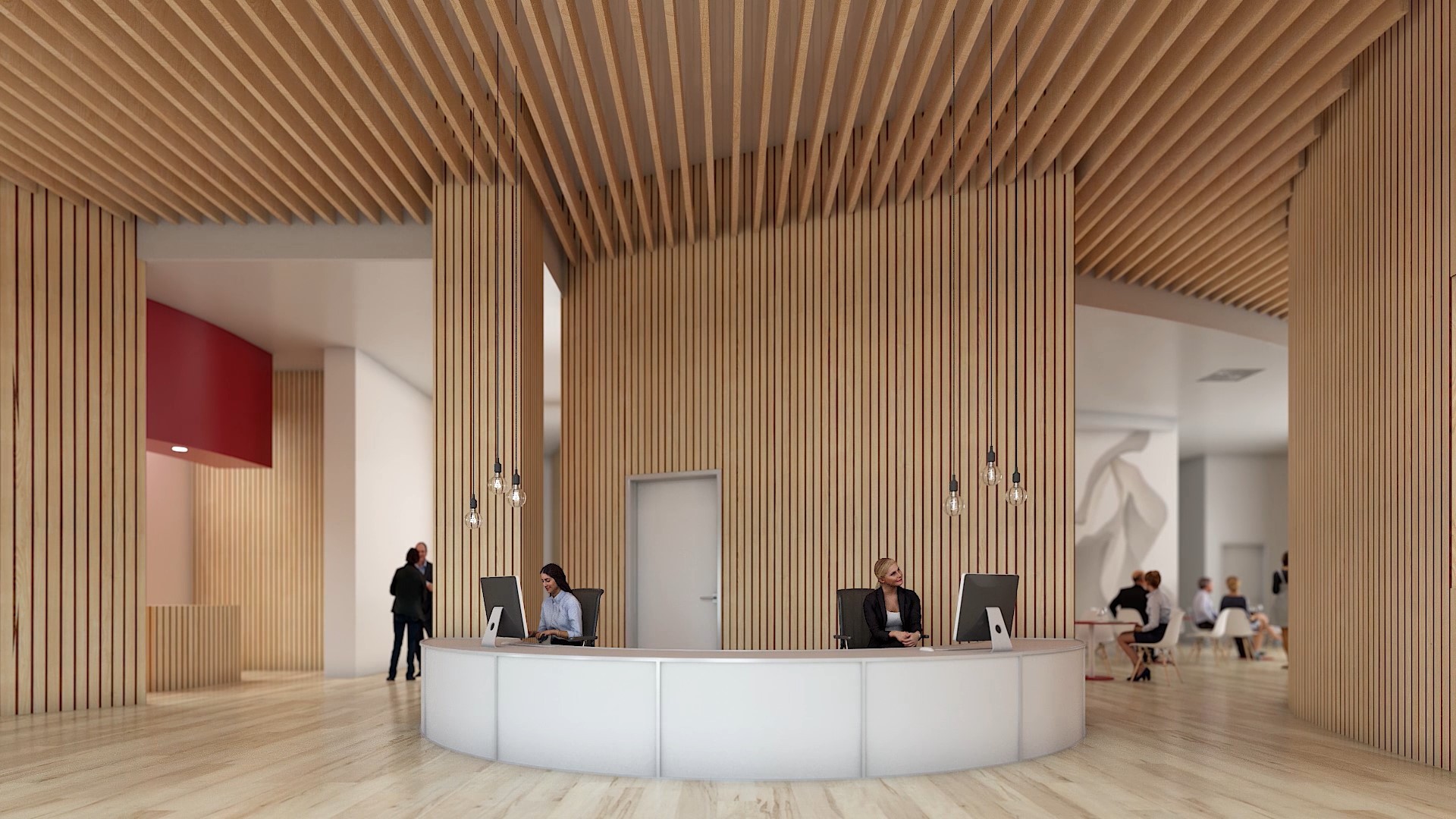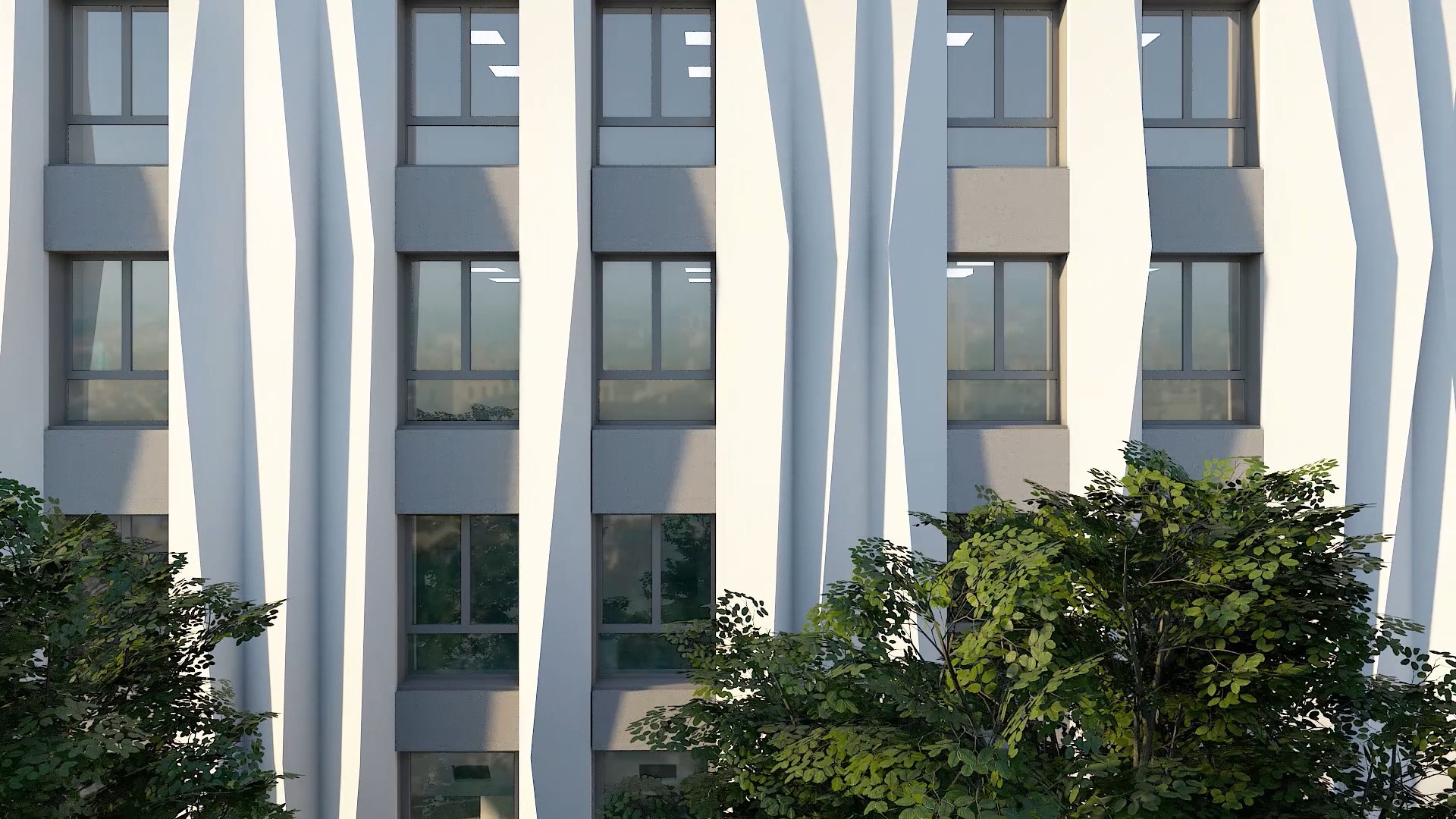 La marcata volontà ed esigenza di portare la luce solare all'interno degli spazi ha portato ad un'articolazione ritmata della facciata: questa presenta un passo compositivo molto chiaro e delineato, con pannelli modulari intervallati da elementi marcapiano e strisce verticali che esasperano volutamente la geometria. Il rivestimento, geometrico e tridimensionale, caratterizza la facciata e conferisce verticalità e dinamismo all'involucro.