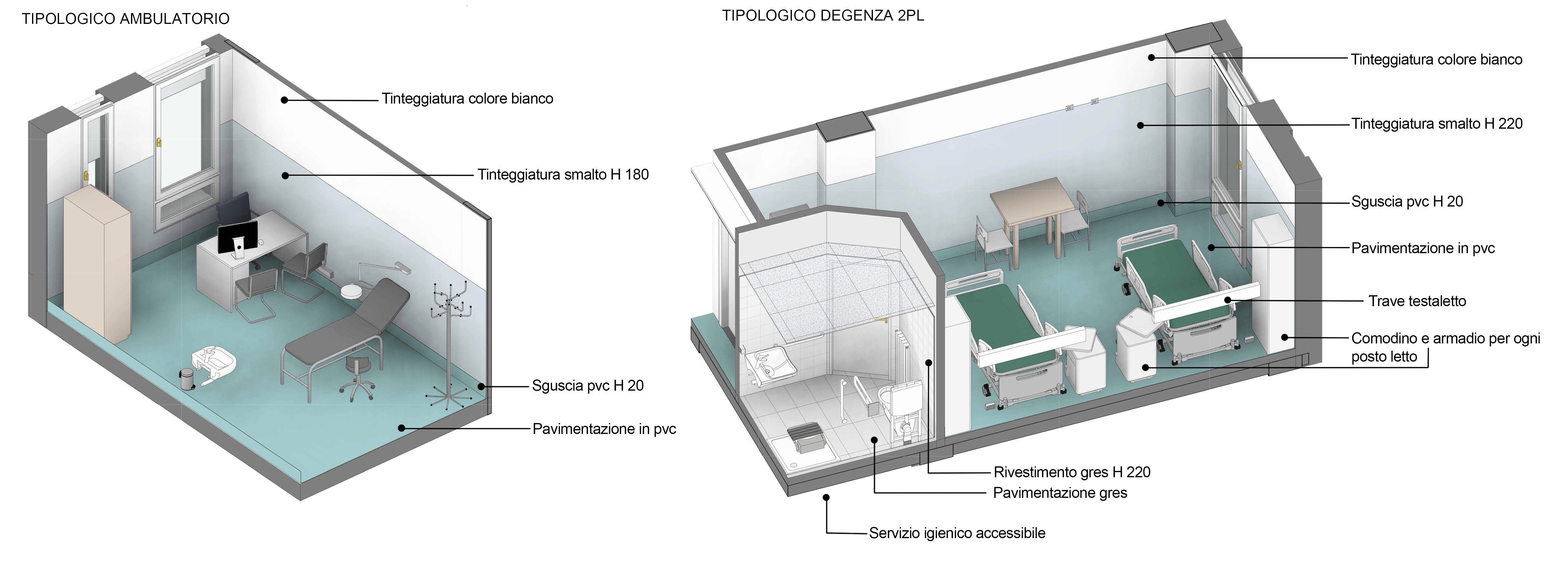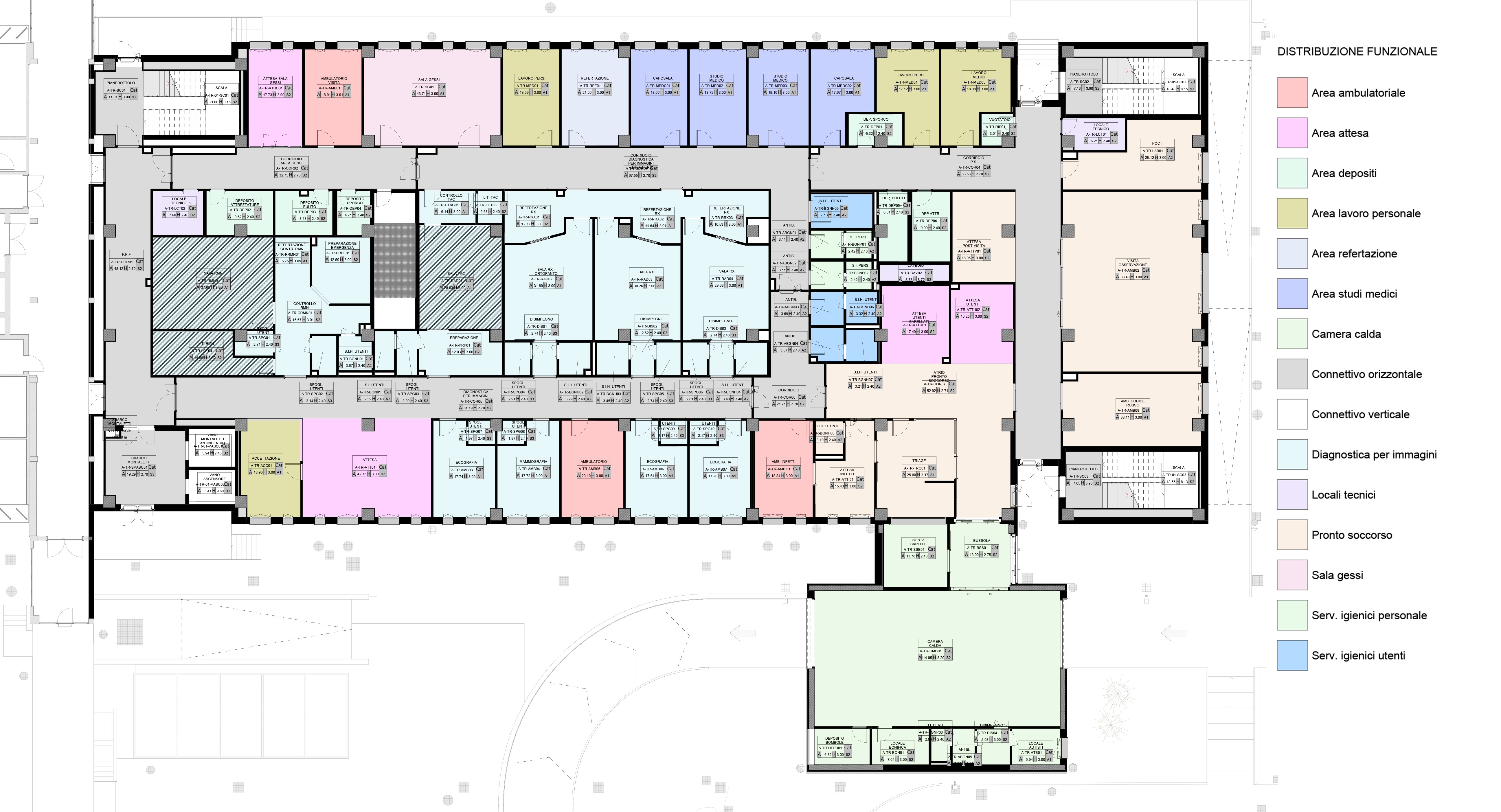 Piano terra: Pronto Soccorso, spazi di attesa, locali di visita/osservazione, locale analisi rapide POCT, ambulatorio per emergenze, area di traumtologia con sala gessi e sala di attesa, reparto di diagnostica per immagini, con spazi di attesa, refertazione e ambulatori anamnesi.