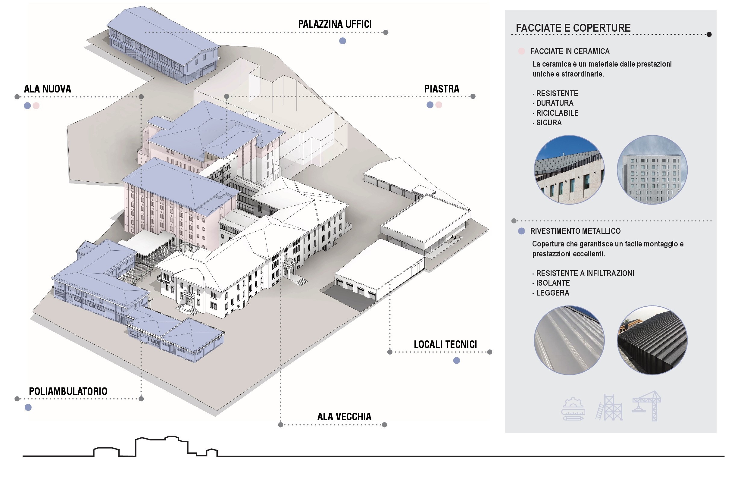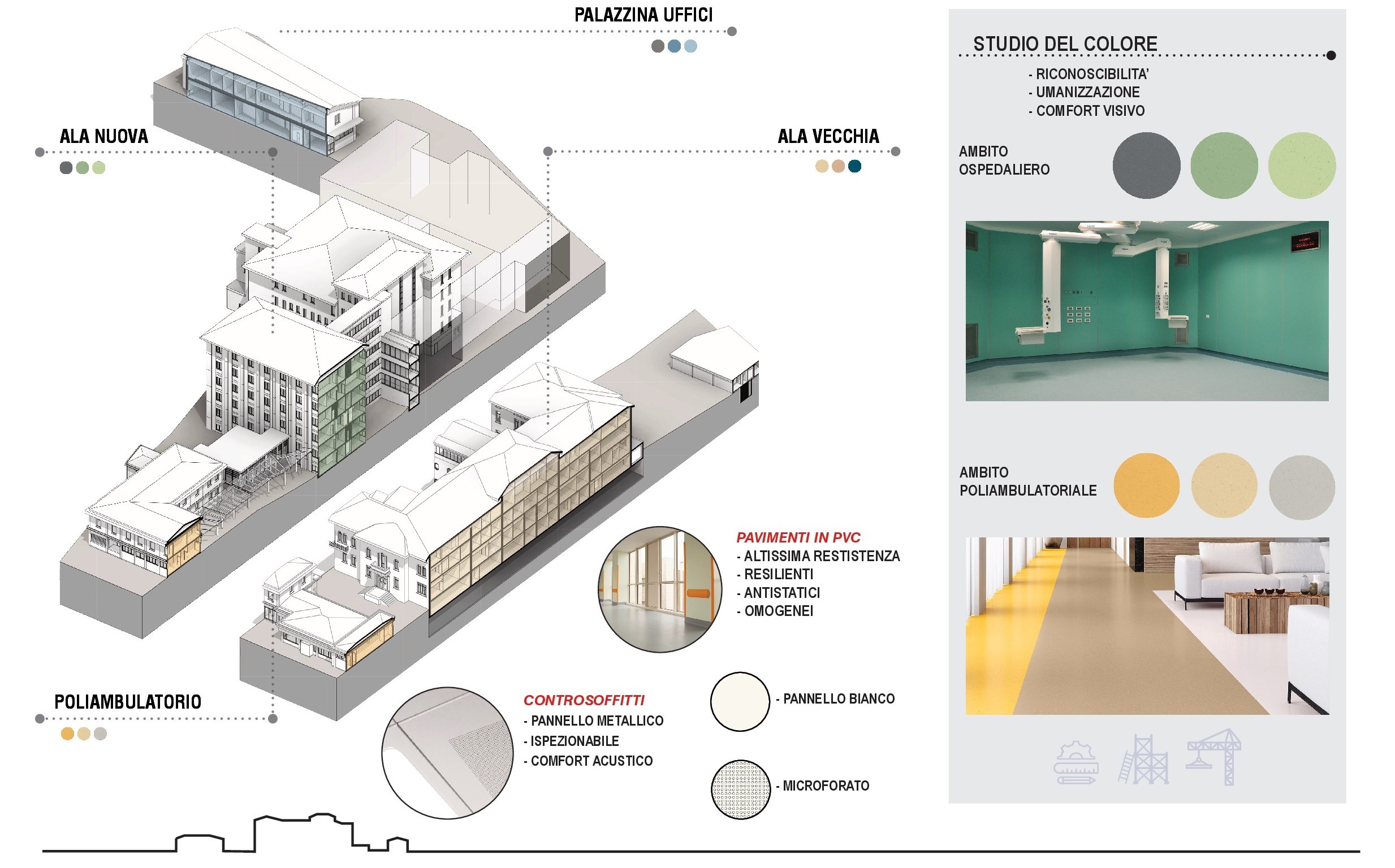 Il progetto reinterpreta l’identità materica e cromatica degli edifici esistenti, sia all'interno che all'esterno, con l’obiettivo di migliorare comfort, funzionalità ed efficienza energetica. Gli ambienti interni, rinnovati con tonalità neutre e accoglienti, sono studiati per favorire il rilassamento e l’orientamento, contribuendo a una maggiore umanizzazione degli spazi ospedalieri e ambulatoriali.