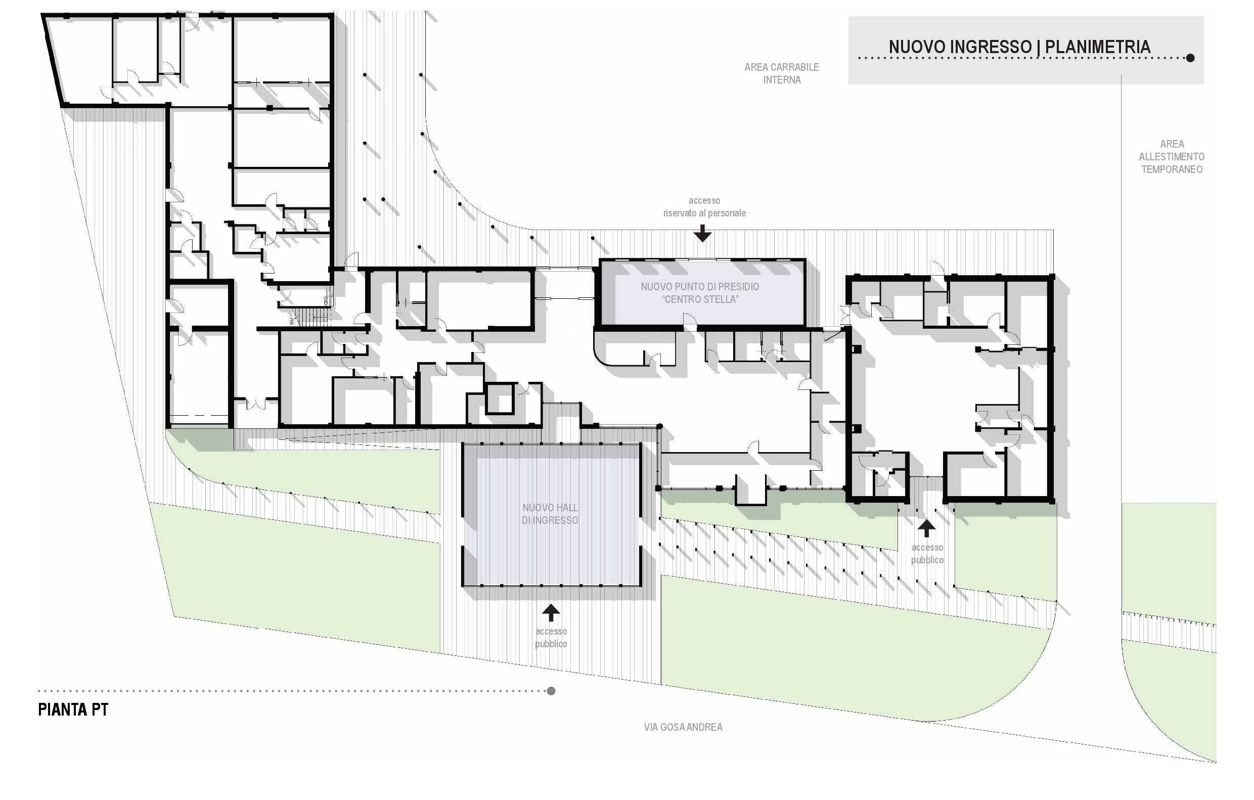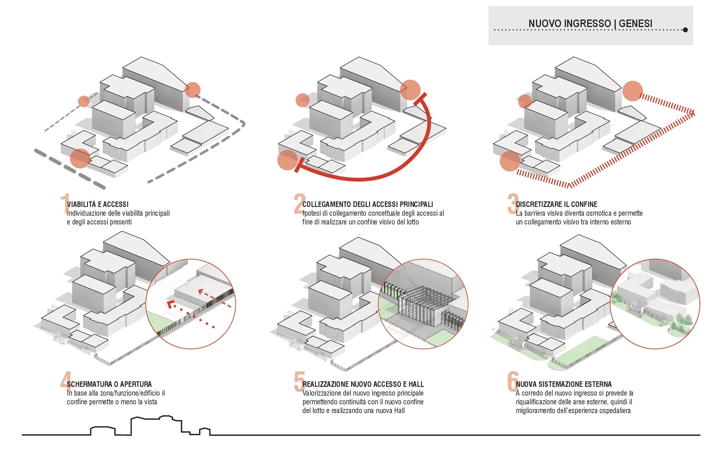 Si prevede la creazione di un nuovo landmark architettonico sul fronte di via Gosa, il quale rappresenterà il nuovo ingresso principale all’area ospedaliera. Il volume, metallico e trasparente, verrà collocato in adiacenza all’attuale ingresso al poliambulatorio, e sarà collegato al secondo ingresso dello stesso stabile mediante un pergolato modulare coperto, che ne riprende stile, materiali e concetto.