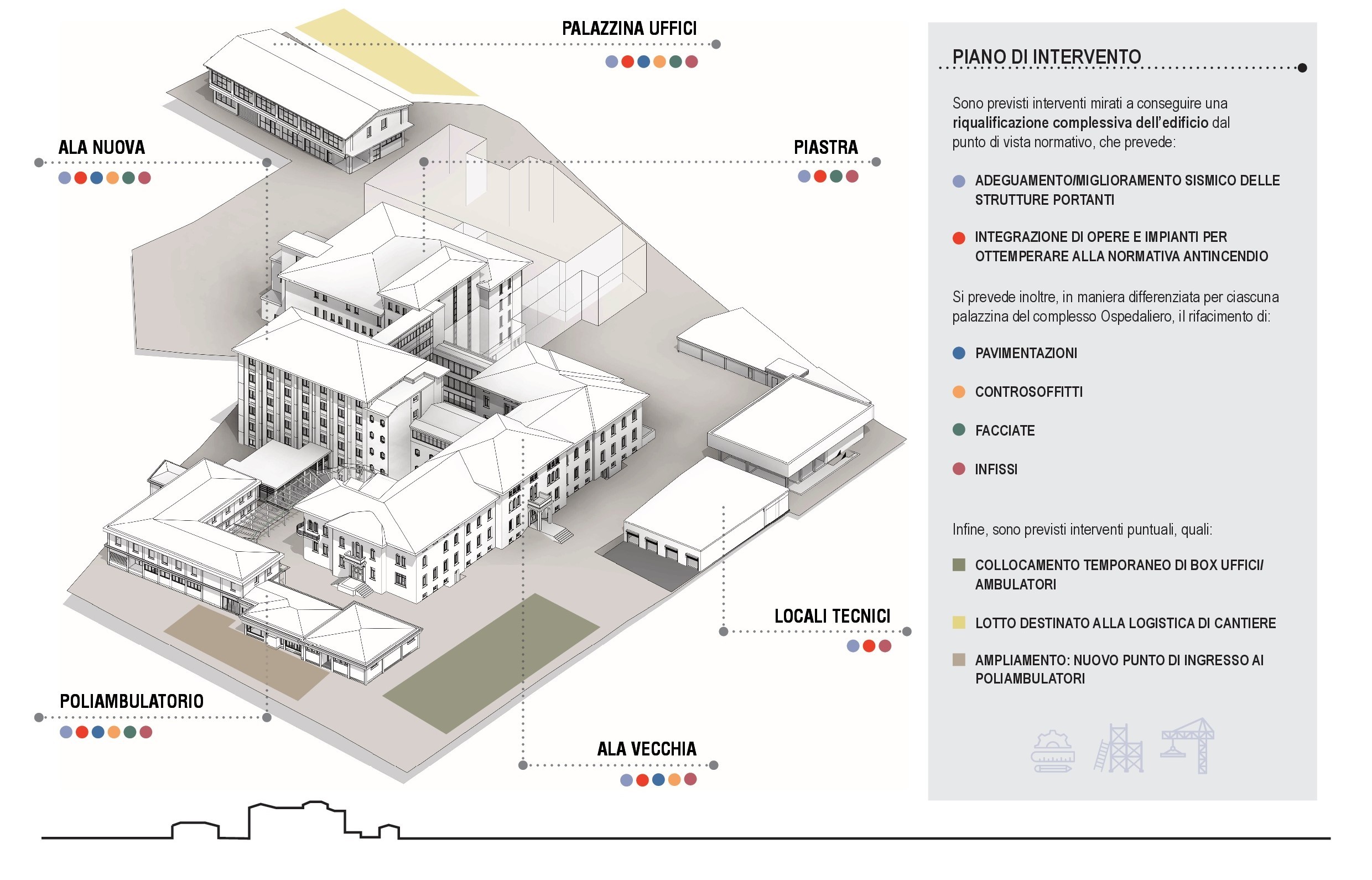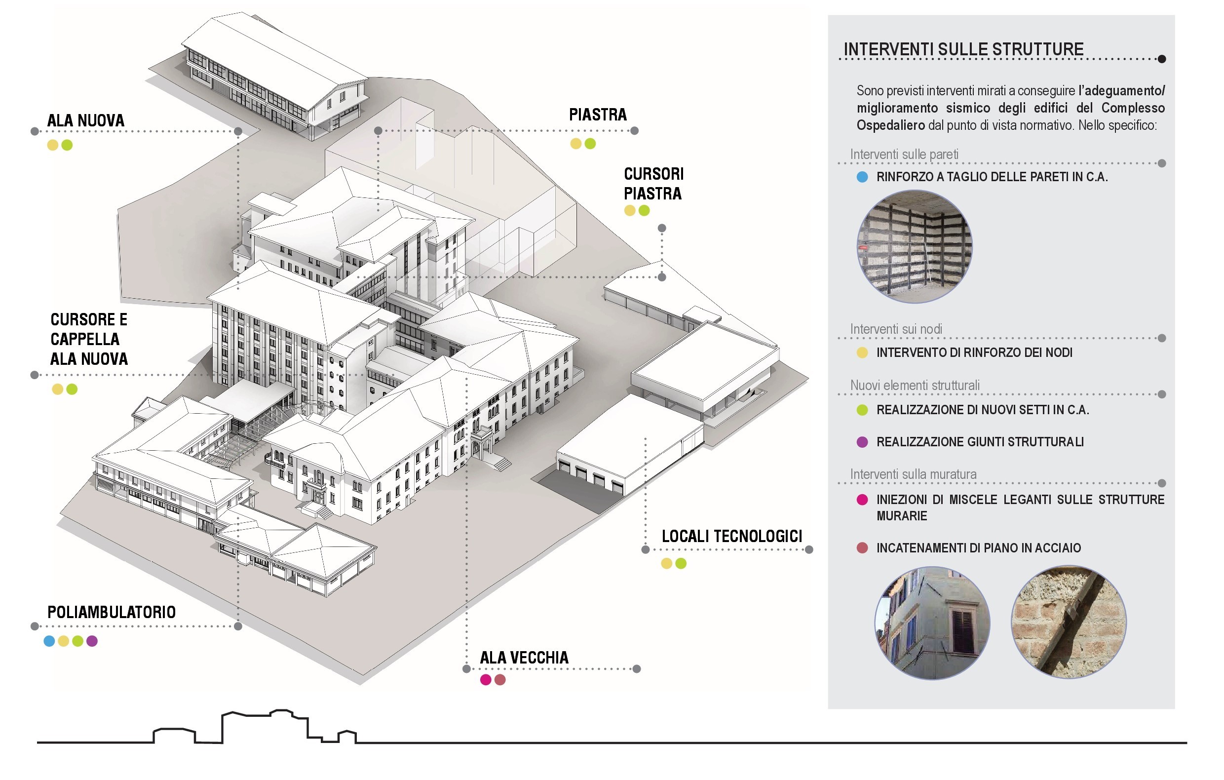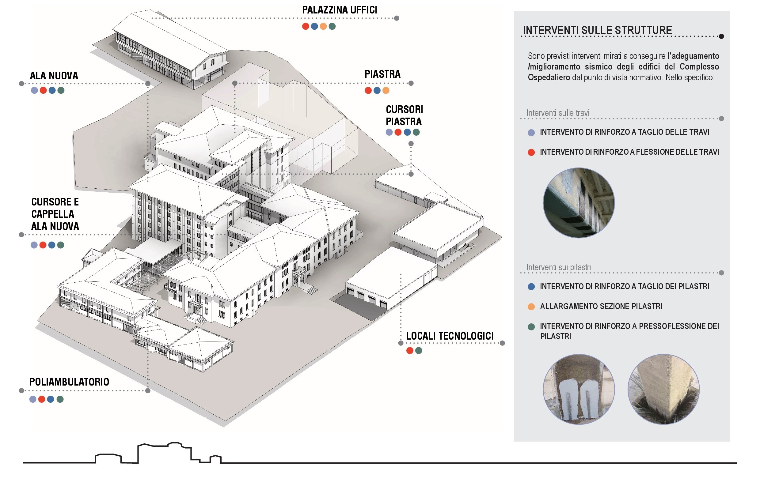 Il progetto prevede inoltre interventi impiantistici mirati: impianti di riscaldamento, climatizzazione, trattamento dell’aria, gas medicali, rete idrico-sanitaria e antincendio, oltre ad un adeguamento/miglioramento sismico dei fabbricati.