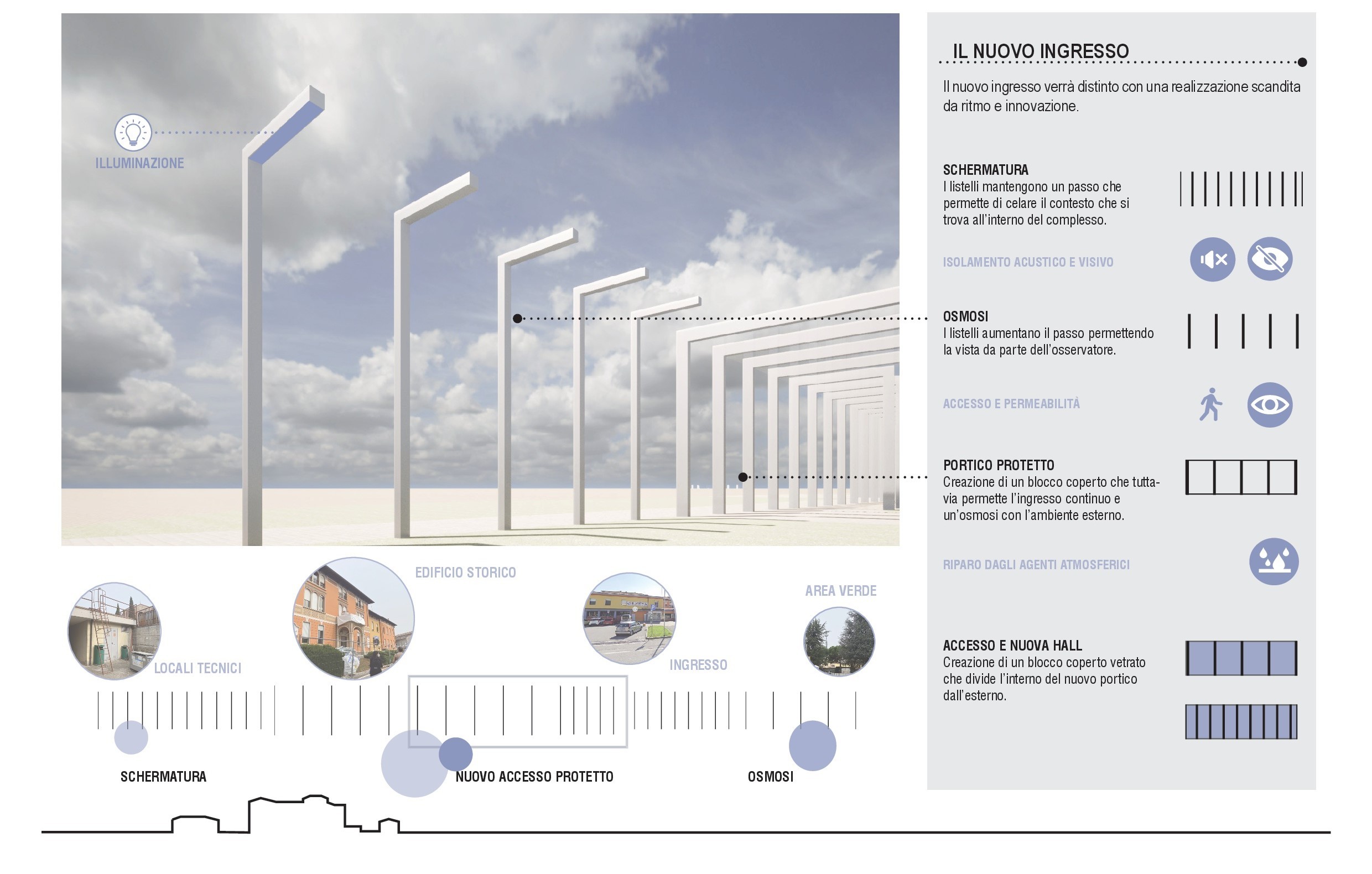 In continuità al nuovo ingresso verrà realizzata una nuova delimitazione del complesso edilizio, mediante una recinzione che ne riprende il concept. I listelli previsti per la delimitazione del complesso saranno caratterizzati da un passo variabile, che permette di celare o sottolineare il contesto che si troverà all’interno del confine, a seconda delle zone e delle necessità.