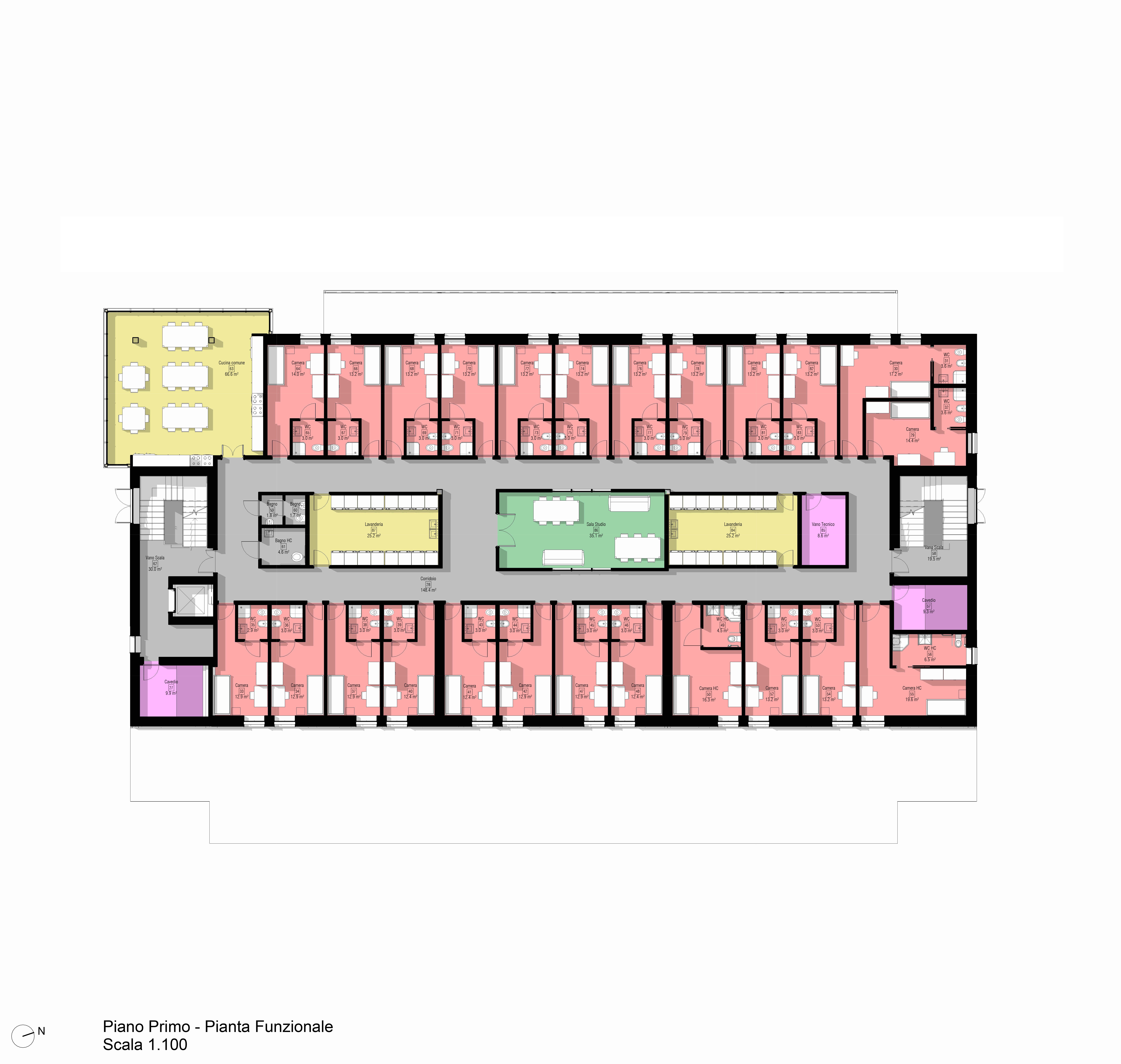L’edificio è sviluppato secondo una logica di divisione tra spazio pubblico e spazio privato. Il basamento è dedicato alla didattica. I piani superiori sono invece interamente dedicati alle residenze universitarie, per un totale di 72 alloggi singoli, di cui 6 riservati a persone con disabilità, ognuno con bagno privato. I piani sono dotati di spazi comuni, quali cucine, lavanderie e sale multimediali.