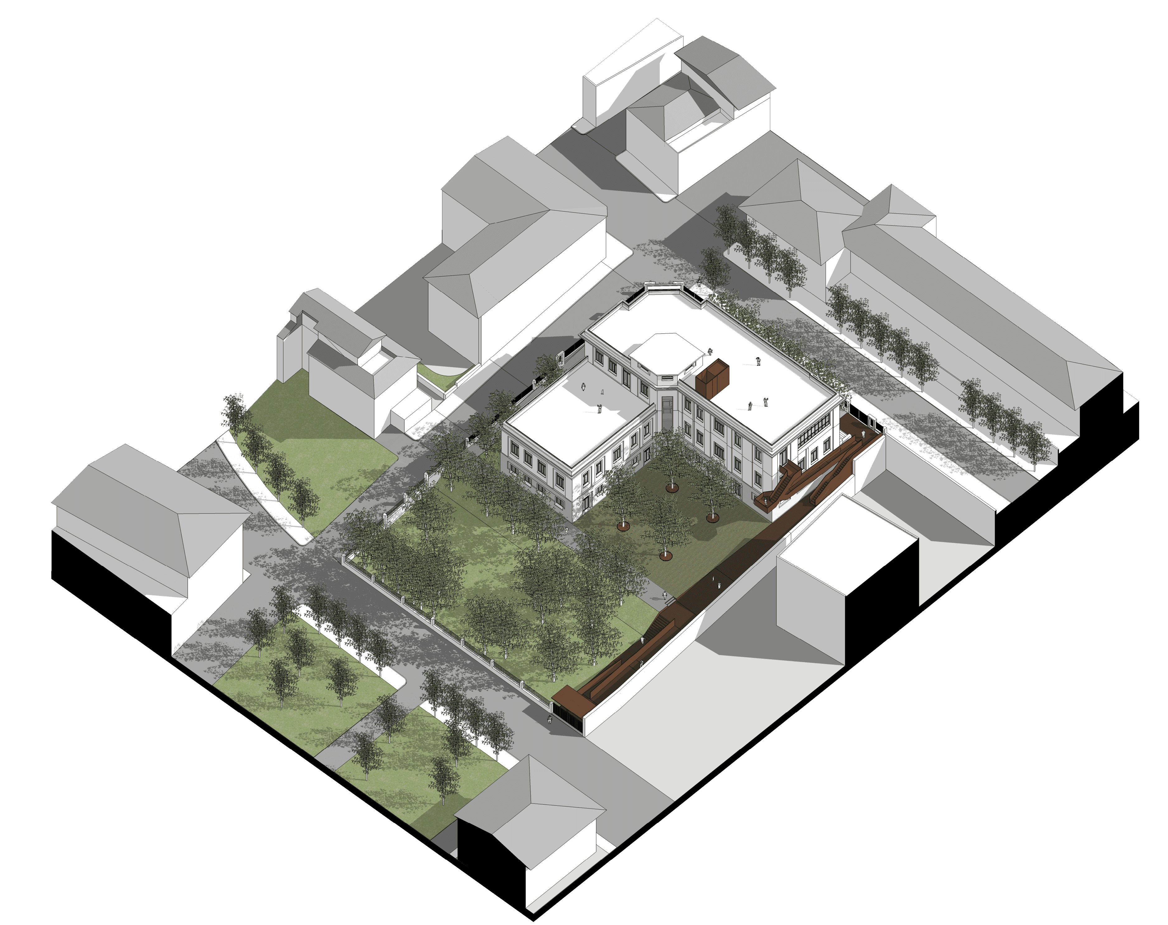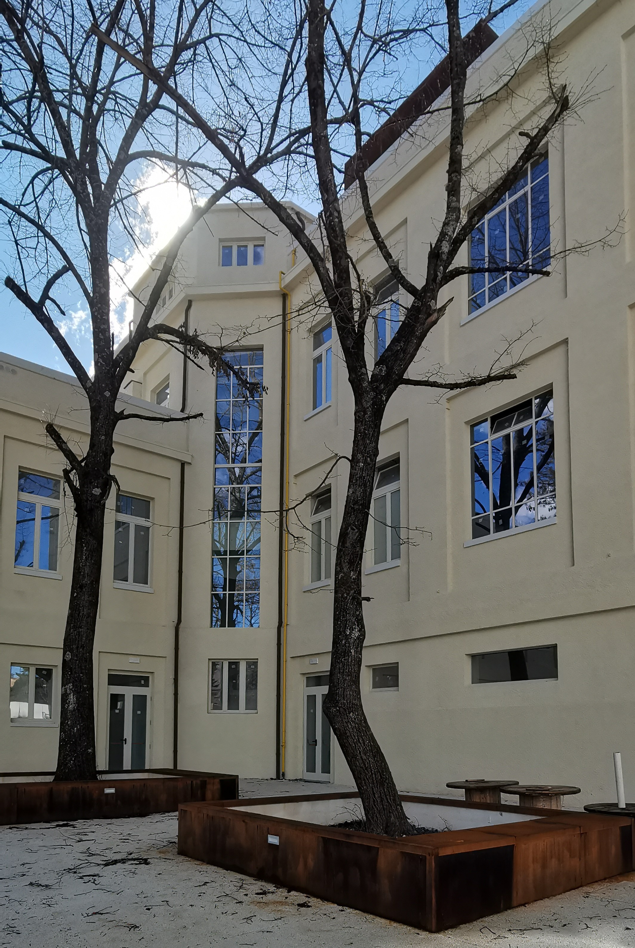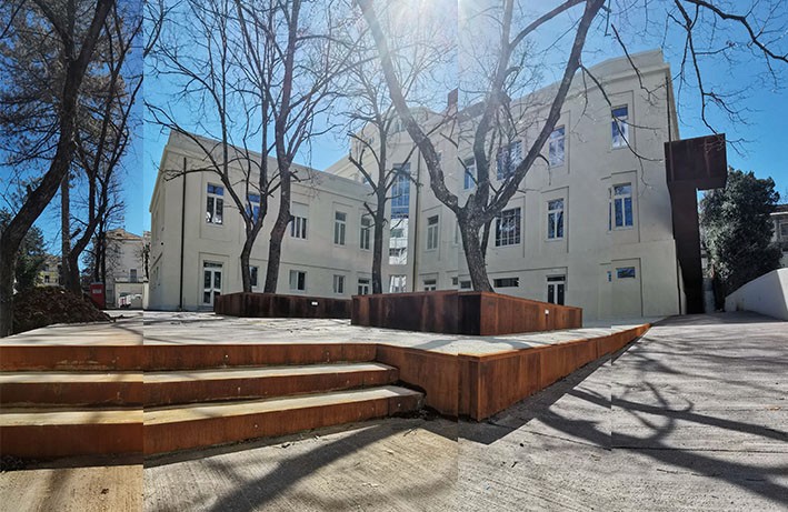 L’elemento architettonico di nuova realizzazione di maggior rilievo dell’intervento in oggetto, è la nuova scala esterna rivestita in corten, con funzione sia di collegamento tra l’accesso sud e nord del lotto che di scala di emergenza/via di fuga e di percorso di accessibilità per disabili all’edificio al piano mezzanino.