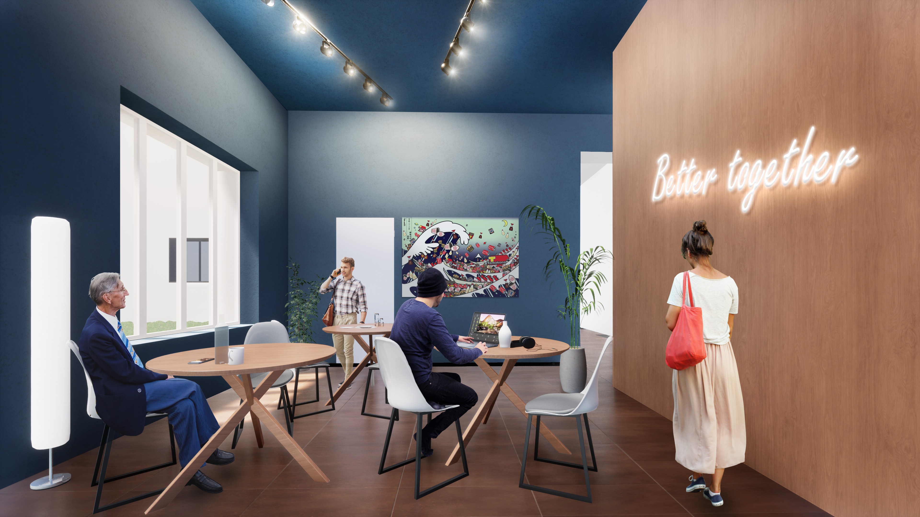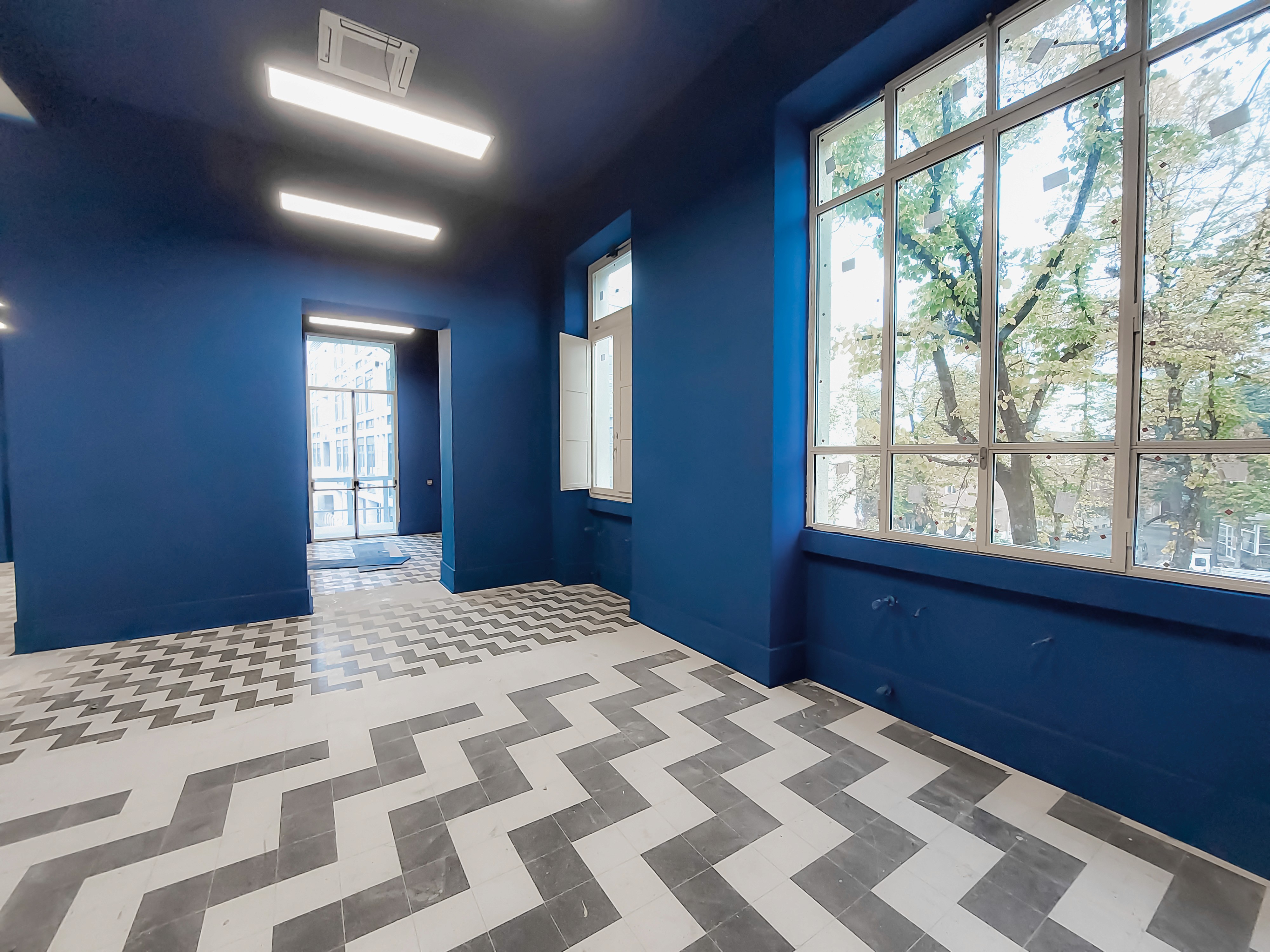 Internamente si vede la contrapposizione fra materiali tradizionali come le pavimentazioni geometriche e colorazioni frizzanti a parete.