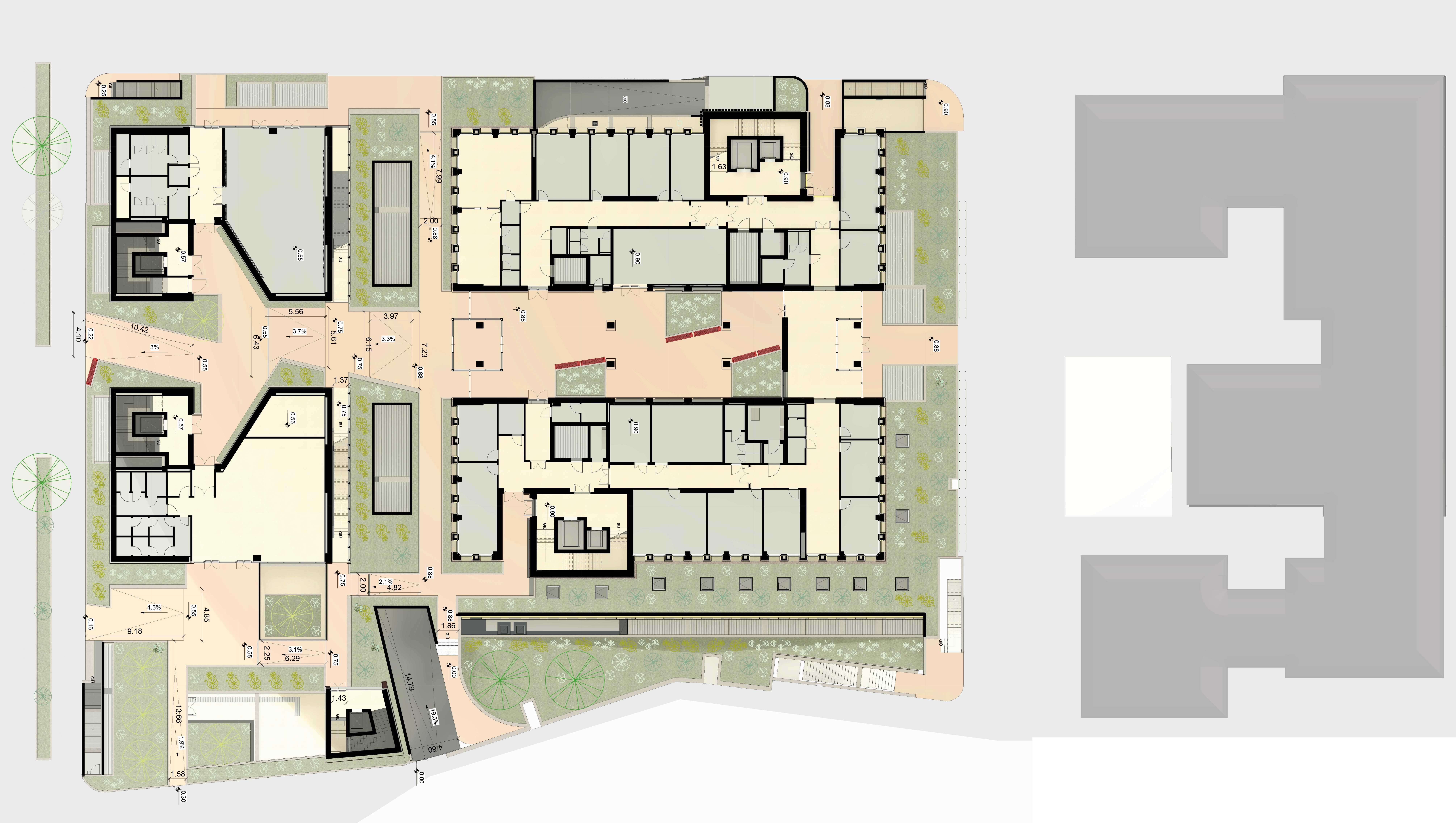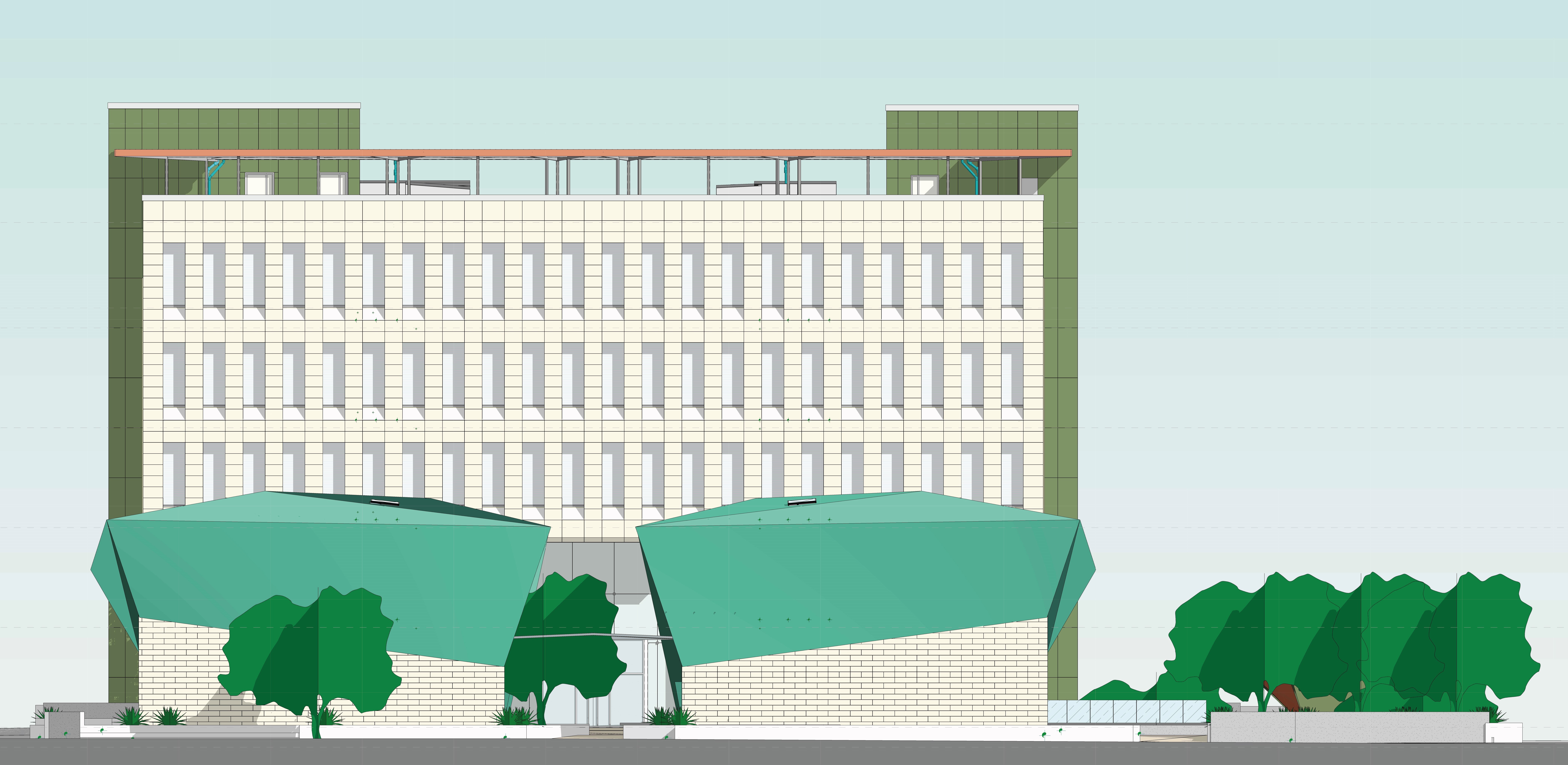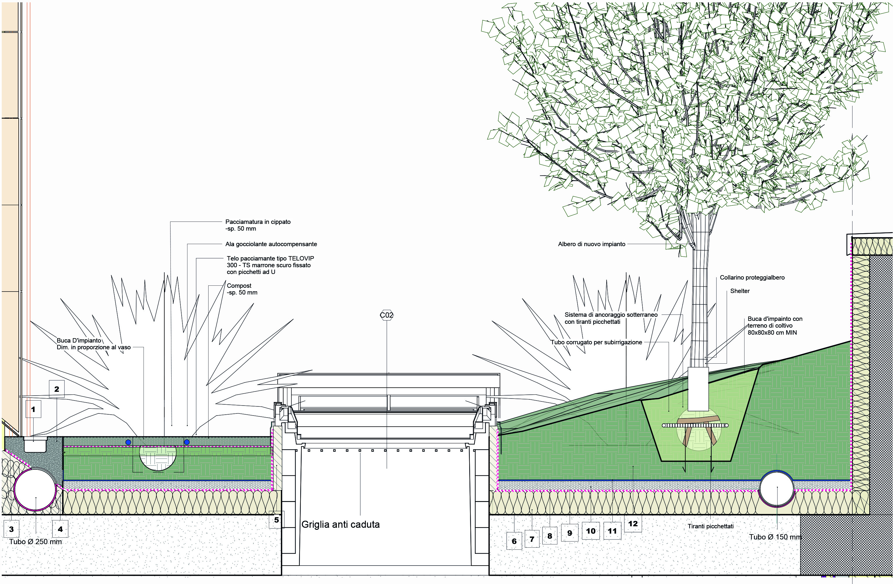 In questo scenario, il progetto del verde diventa un elemento intrinseco di rilettura e trasformazione dl progetto edilizio, mirando a garantire una dotazione di verde utilizzando specie autoctone e rustiche, perciò a bassa manutenzione. Si è cercato di creare una “continuità di verde” tra l’ingresso rialzato, la facciata nord e le torri laterali, che fungono da elementi di visibilità.