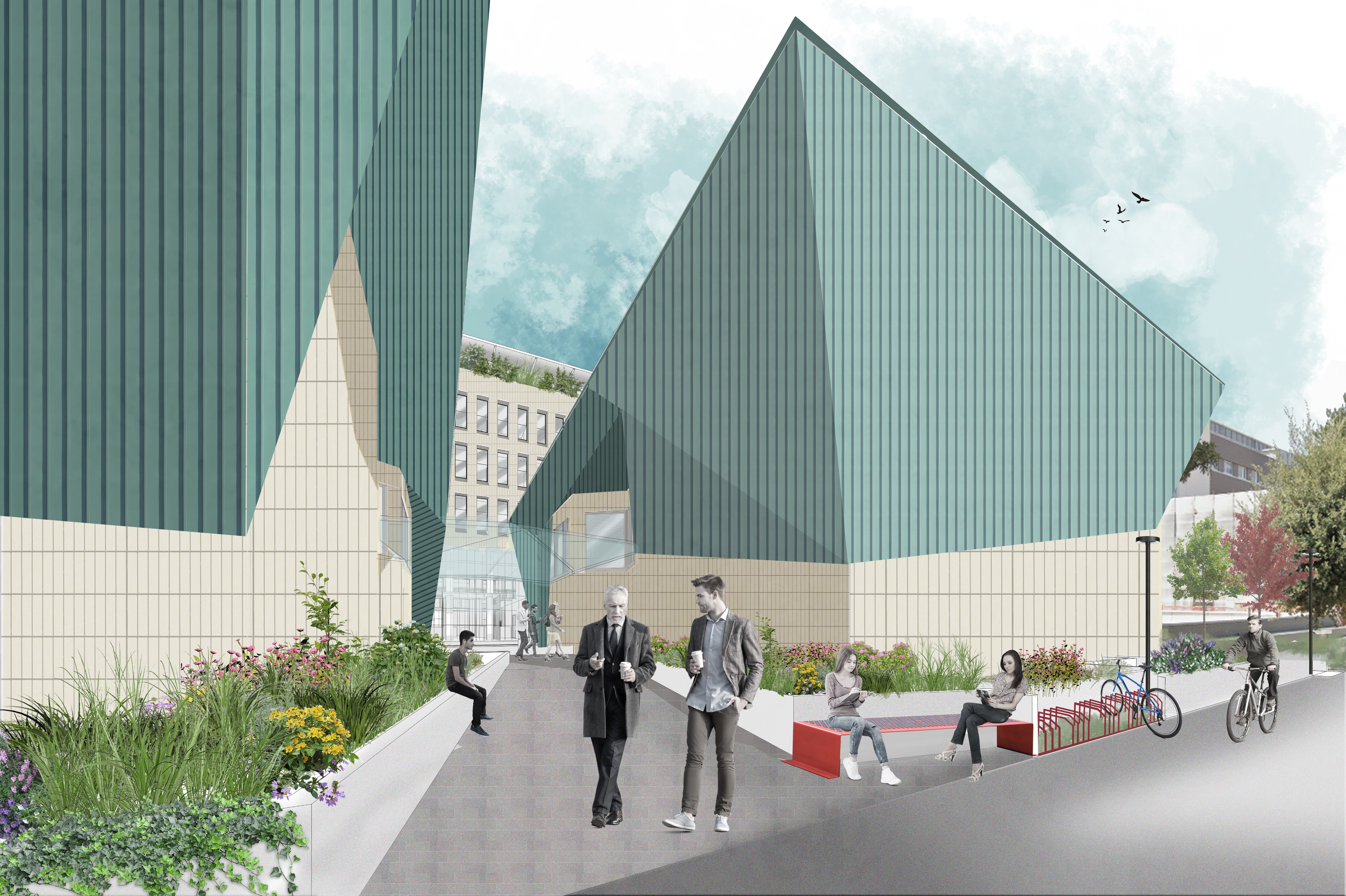 Elemento centrale del progetto è la ricerca della qualità edilizia, espressa attraverso materiali nobili come vetro, pietra e rame, che conferiscono agli edifici un aspetto moderno e riconoscibile. La Torre, con la sua geometria cubica rivestita, simboleggia solidità e rigore. Le coperture in rame delle aule, dinamiche e inclinate, richiamano il legame tra la tradizione medica bolognese e l’innovazione scientifica.